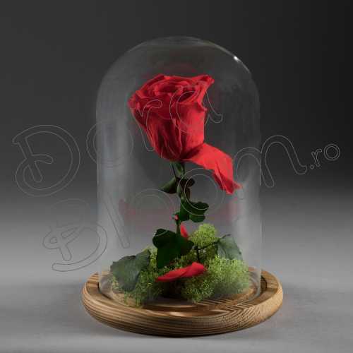 Cea mai frumoasa poveste de dragoste, Frumoasa si Bestia! Ce fetita nu s-a visat printesa? Ce iubita nu si-ar dori un cadou special, care sa straluceasca doar pentru ca ea te iubeste? Iata, acum, poti spune ca "visele devin realitate!", iar trandafirul din povestea "Beauty And The Beast" nu se va ofili! Acum poti comanda acest aranjament floral sub o cupola de sticla cu un design deosebit din plante conservate, care ramane intact multi ani, fara a fi necesara o ingrijire speciala. La cerere, creatia se poate executa cu alta culoare a trandafirului.