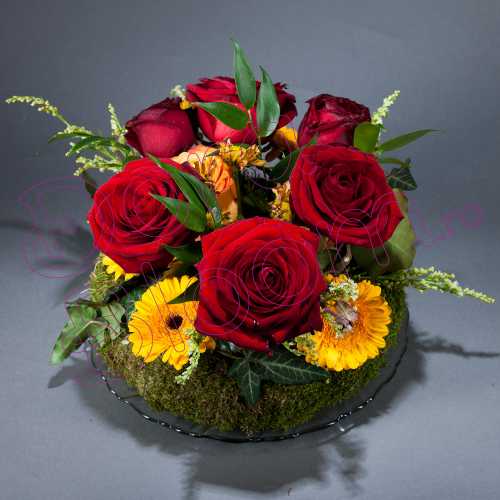 Un aranjament floral vesel realizat cu trandafiri si gerbera. La cerere, se poate modifica componenta cromatica/compozitionala a creatiei.