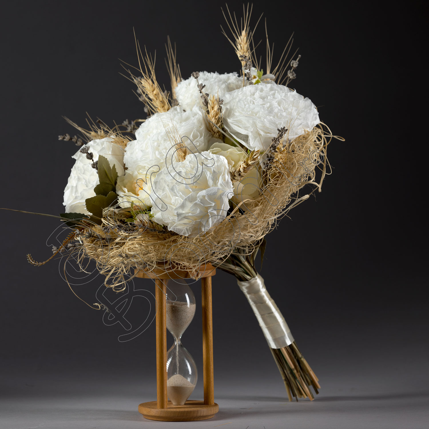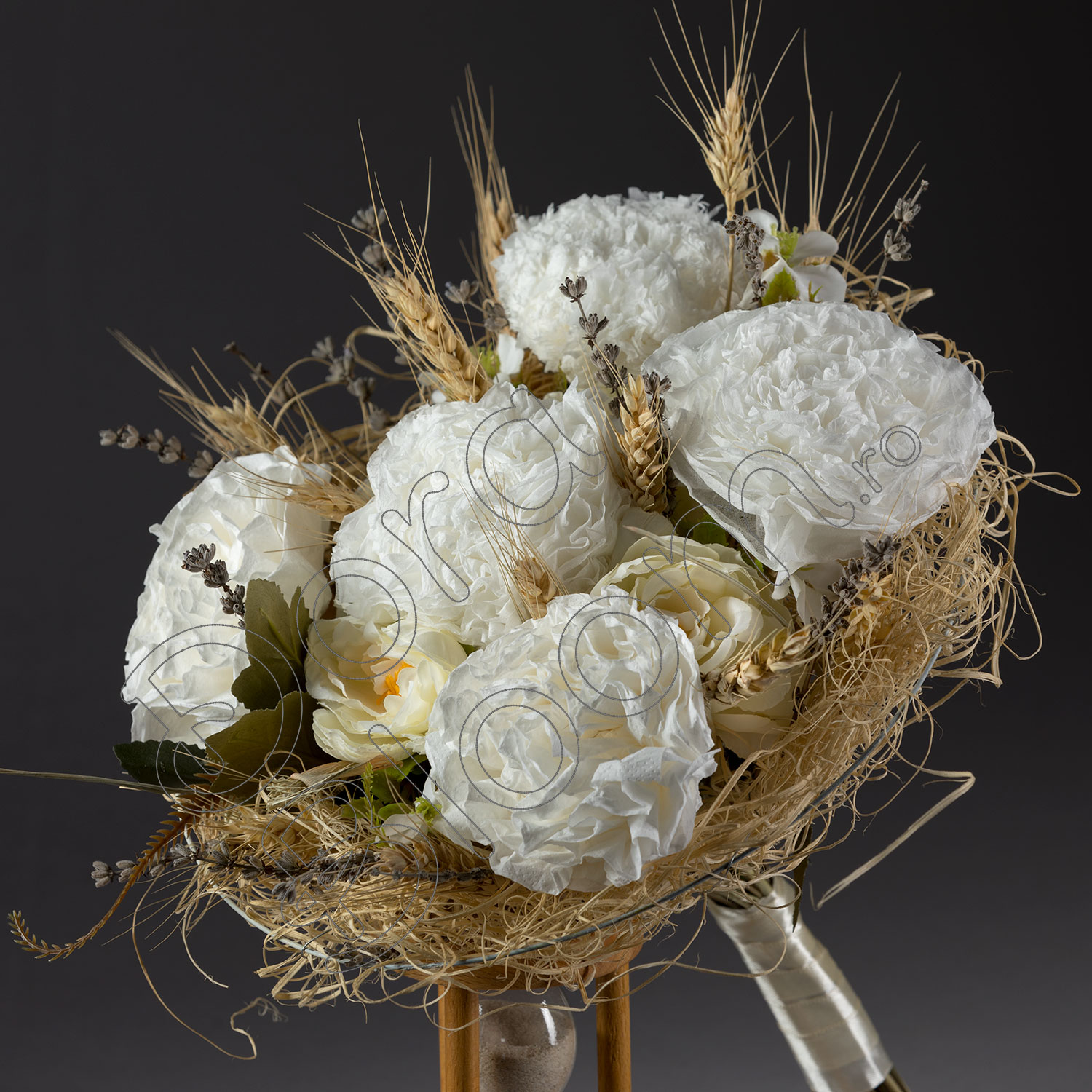 Buchet de flori decorat rafinat cu grau si lavanda creat intr-un suport asortat, care marcheaza aniversarea unui an de la casatorie.