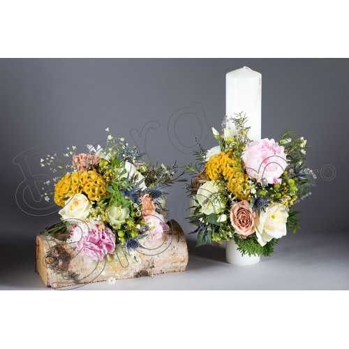 Pentru ziua cea mare, ziua cununiei, alege accesoriul cel mai important: buchetul de cununie, realizat din bujori. Bujorul este considerat floarea prosperitatii, simbol al frumusetii si bogatiei. Am adaugat buchetului eleganta trandafirilor culoarea florii de celosia si eryngium si nu in ultimul rand, l-am aromatizat cu delicata floare de musetel. aLa cerere, combinatia de culori se poate modifica si personalizam asortat lumanarile pentru cununie - creatia se realizeaza functie de disponibilitatea florilor in sezon