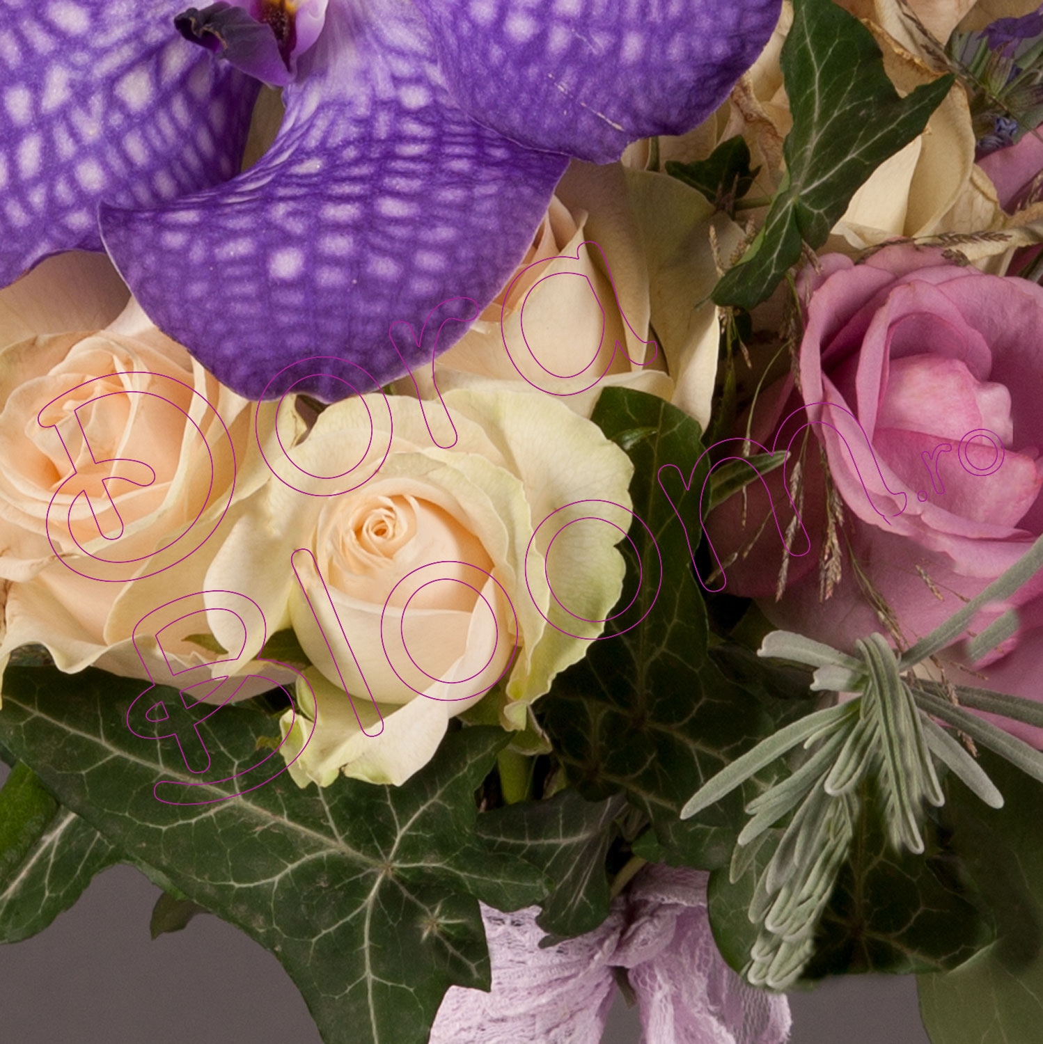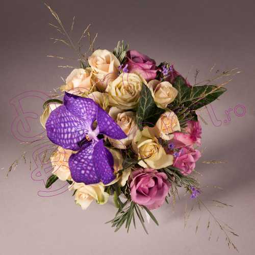 Buchet de flori proaspete realizat din trandafiri, peste care, am asezat flori de orhidee Vanda, orhideea de o frumusete rara.