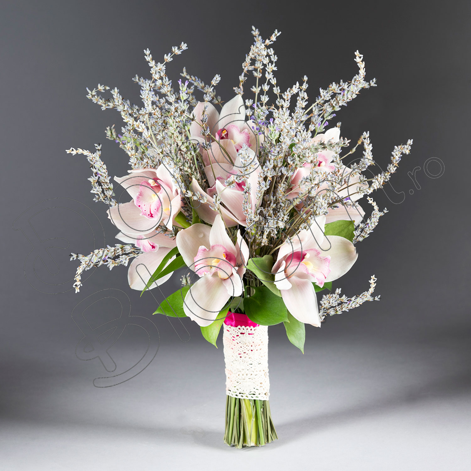 La cerere, se poate alege culoarea cupei de orhidee: alb, galben, portocaliu, rosu, maro sau verde si asortam buchetului atat lumanarile de cununie, cat si buchetul nasei.