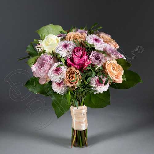 Adu veselia in casa din prima zi a casniciei si alege un buchet colorat, elegant decorat cu trandafiri asortati in ton cu culoarea preferata si crizantema a carei semnificatie este "ma gandesc mereu la tine".