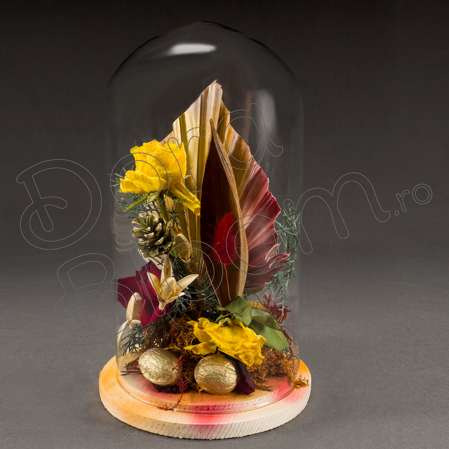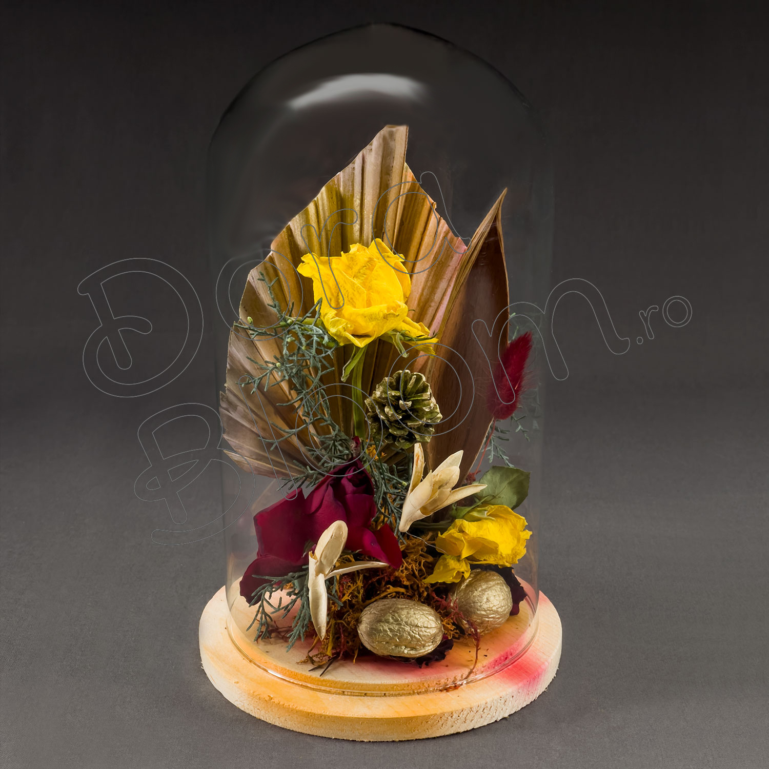 Un cadou floral rafinat in cupola de sticla, realizat cu plante conservate si accesorii de toamna, care se pastreaza in timp, fara a fi necesara o ingrijire speciala. La cerere, cromatica aranjamentului floral se poate modifica functie de preferinte
