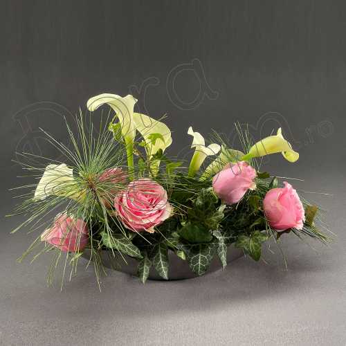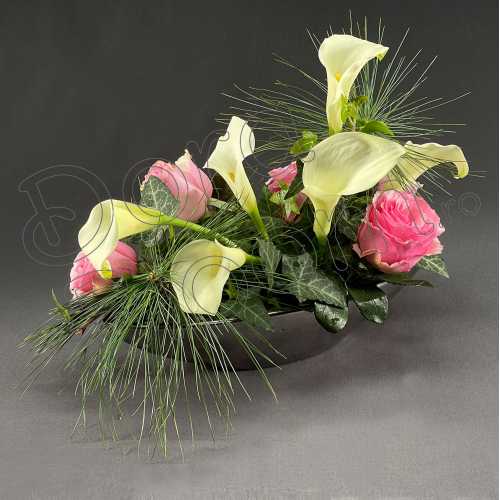 Aranjament floral cu trandafiri si cale albe. Rafinat si elegant, cadoul poate fi oferit in dar cu orice ocazie si se poate realiza in nuantele preferate.