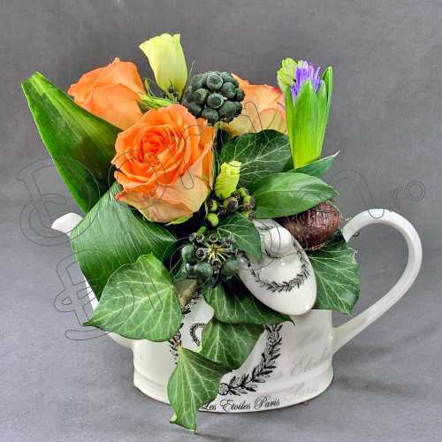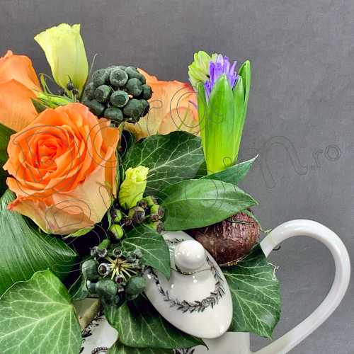 Ceainic de portelan decorat cu trandafiri si flori de primavara cu bulbi. Este un martisor original, potrivit pentru orice varsta. La cerere, aranjamentul floral se poate personaliza, conform preferintelor.