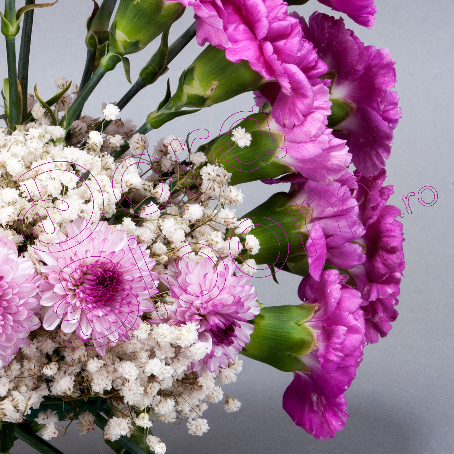Aranjament floral de oferit persoanei iubite, O creatie realizata din garoafe proaspete, cu un model original, desfasurat astfel incat poate fi admirat din mai multe unghiuri. Garoafa este o floarea delicata, care nu necesita o ingrijire speciala, pe care o gasim intr-o multitudine de culori, disponibila in tot timpul anului. La cerere, aranjamentul floral se poat modifica in nuantele preferate.