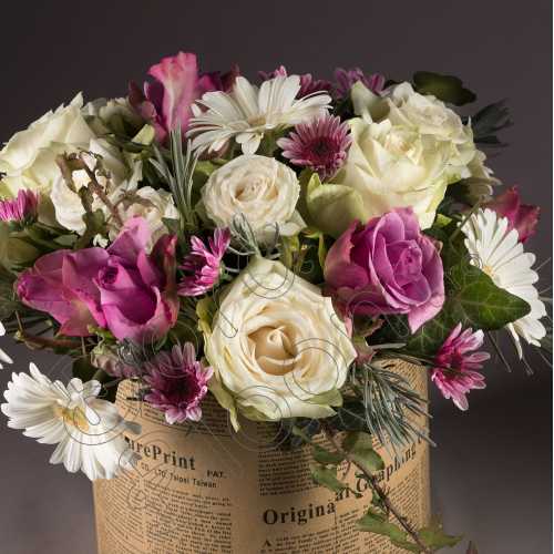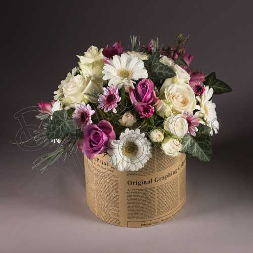 Un aranjament floral vesel, realizat intr-o cutie rotunda, spre a fi oferit in dar fara a fi o ocazie speciala. La cerere, compozitia florala din trandafiri, gerbera si crizantema se poate modifica conform preferintelor.