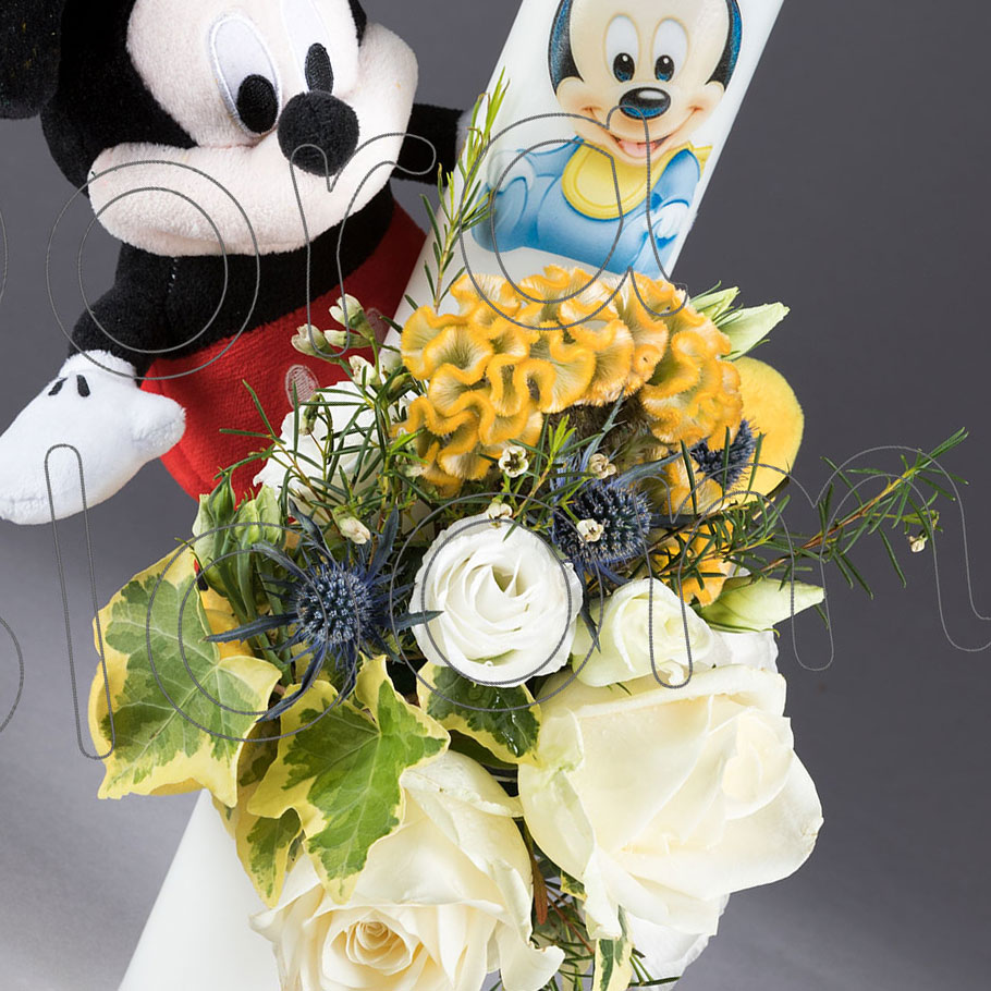 In functie de tema evenimentului, se poate alege forma aranjamentului, personajul pictat, cat si compozitia florala. La cerere realizam decorul cristelnitei asortat aranjamentului lumanarii si cream arcada cu baloane colorate.
