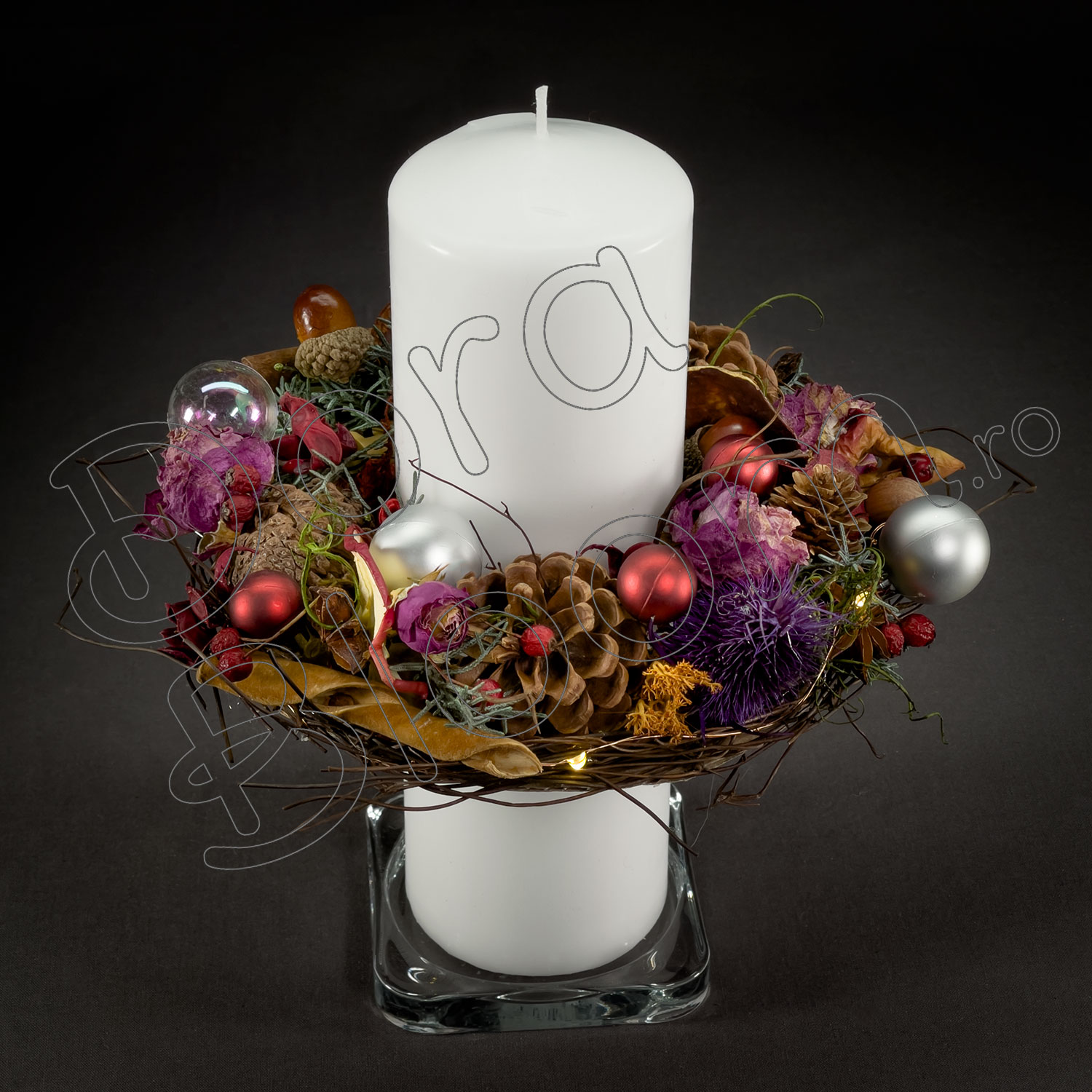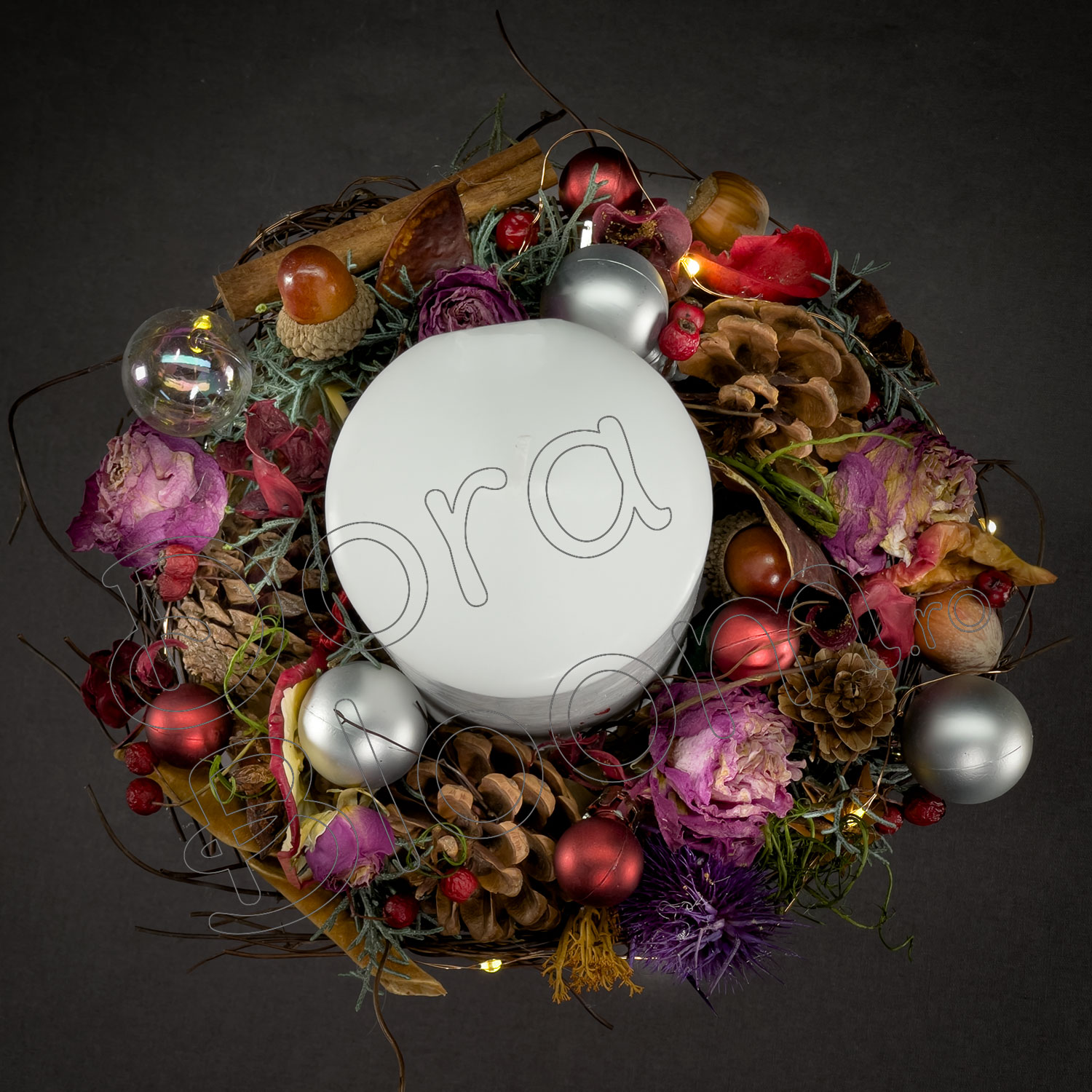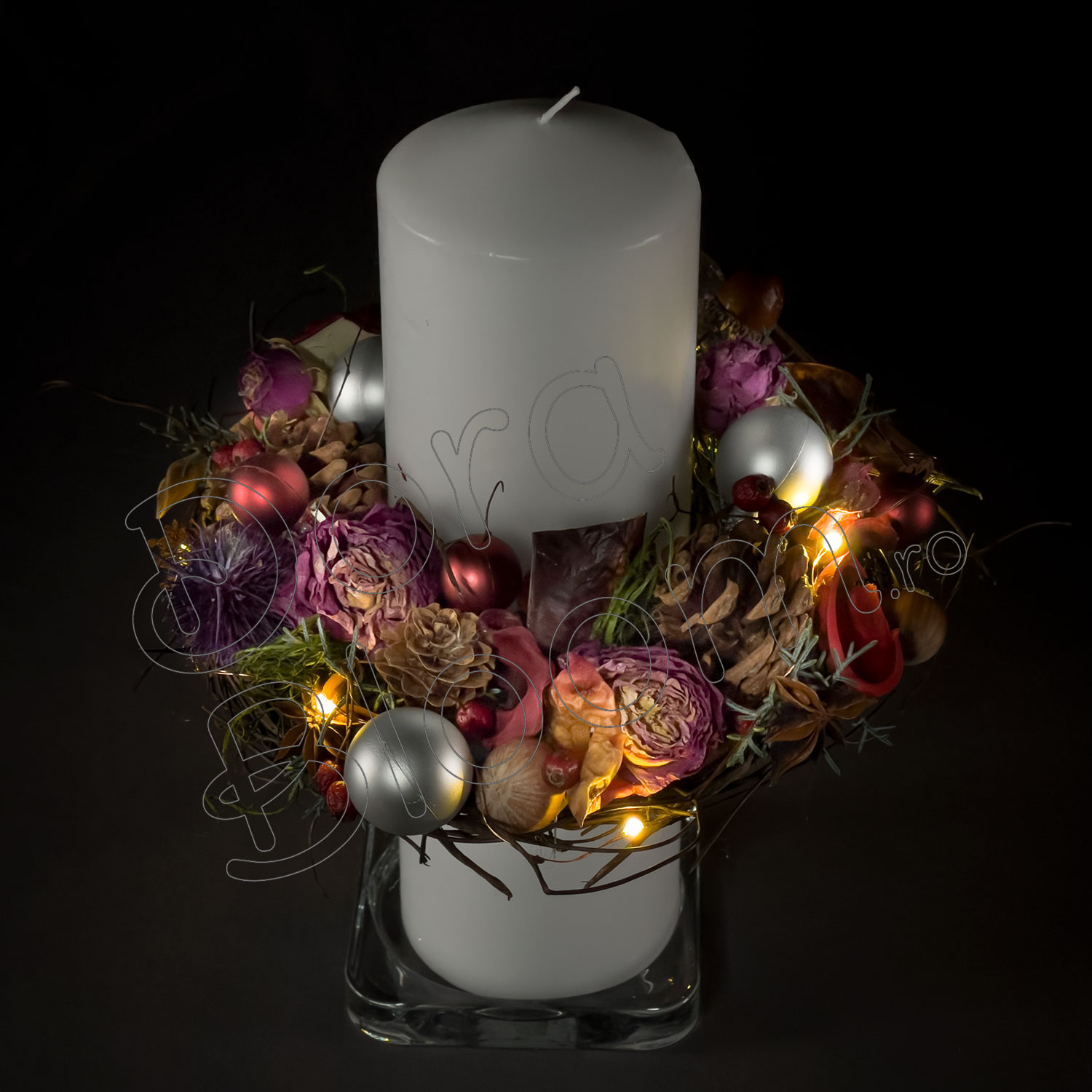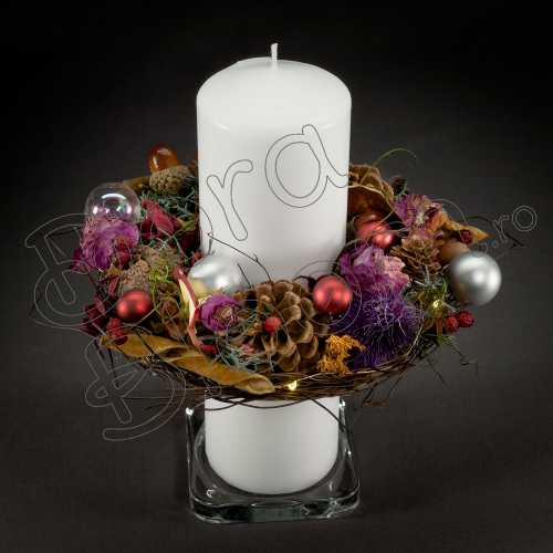 Un decor floral cu accesorii de iarna marca Dora Bloom asezat pe o lumanare, care va lumina perioada de Sarbatori, este un cadou original, este o surpriza inedita, este un "Bine ati venit!" asezat intr-o receptie.
