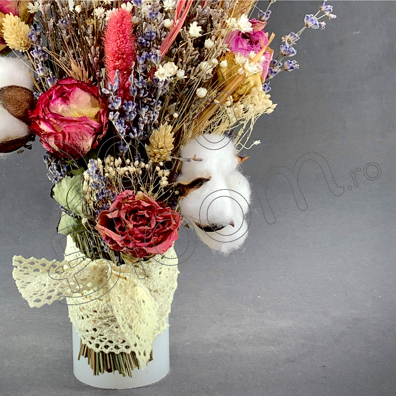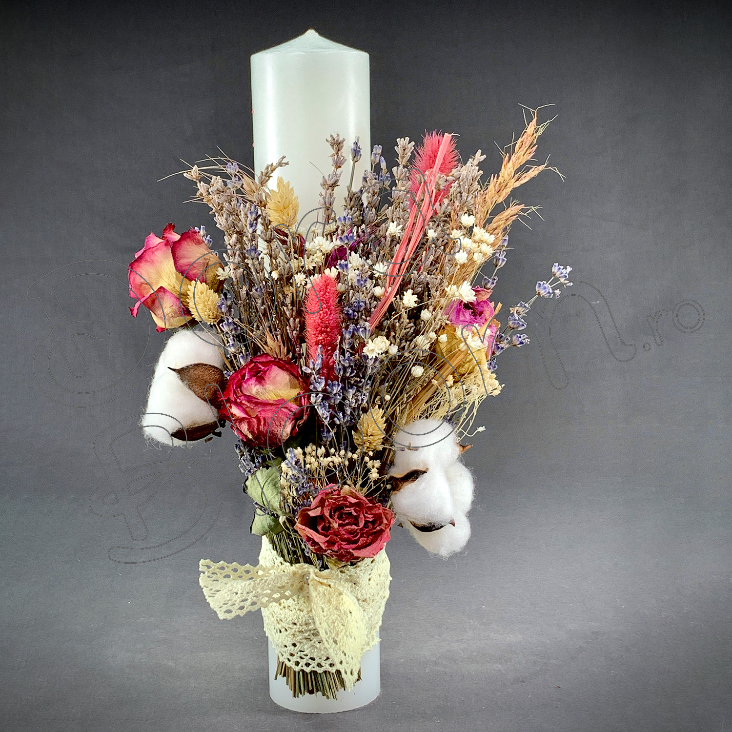 Lumanarea pentru botez, simbolul valoros pe care il primesti cand esti crestinat. Aranjament floral elegant realizat din flori de bumbac, plante prezervate si uscate si prins elegant cu dantela pe o parte a lumanarii.
