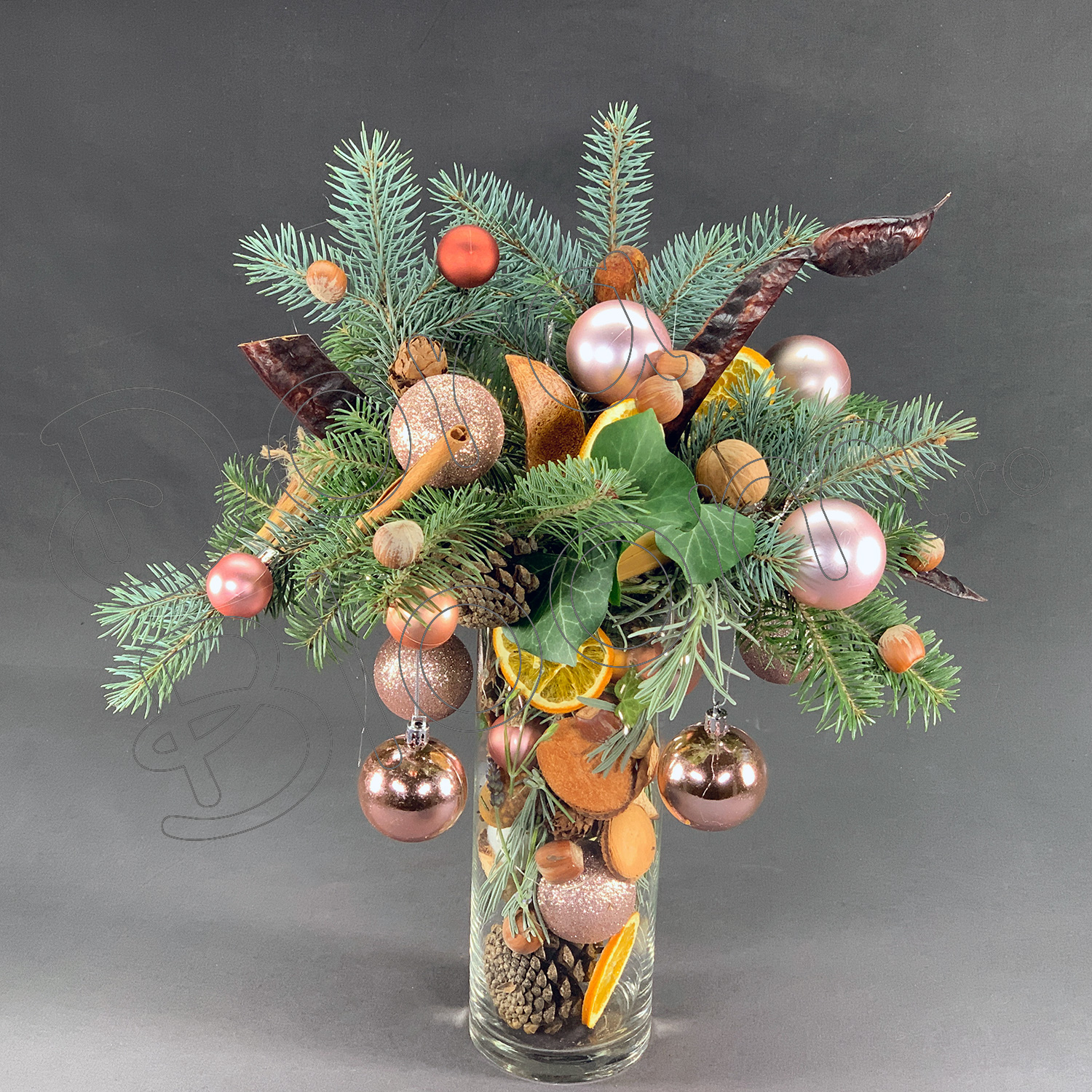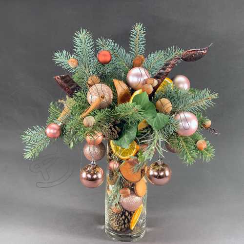 Un brad de Craciun original, asezat intr-un cilindru de sticla ( 35 cm inaltime) decorat pentru sarbatori cu accesorii specifice: floare de bumbac, globuri, felii de portocala, scortisoara, anason, ghinde, conuri de brad si beculete lumioase.