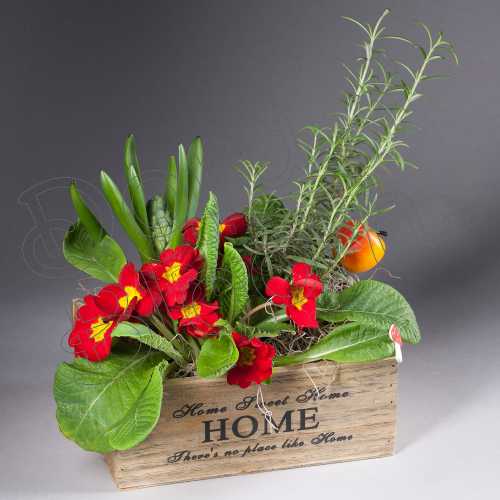 Martisor floral rafinat, elegant asezat intr-un vas rustic, decorat cu plante vesele de primavara. La cerere, cromatica aranjamentului floral se poate modifica in functie de preferinte sau in ton cu sigla companiei.