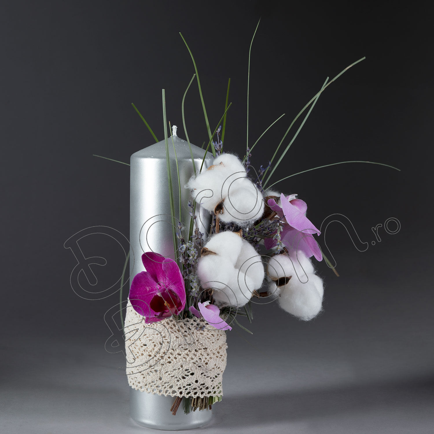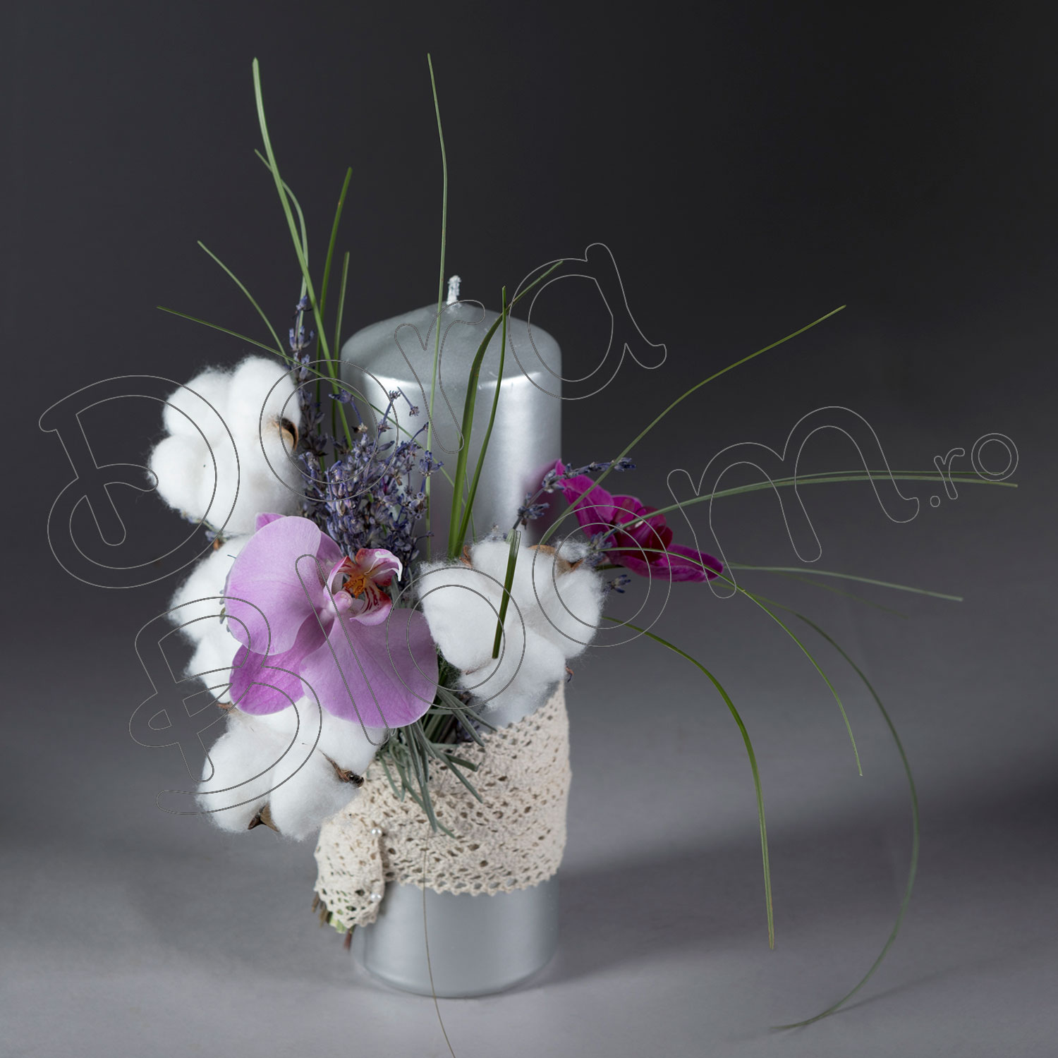 Lumanarea pentru botez, simbolul valoros pe care il primesti cand esti crestinat. Aranjament floral unicat, asezat pe o parte a lumanarii realizat 3D din flori de orhidee, lavanda si bumbac prins cu o dantela.