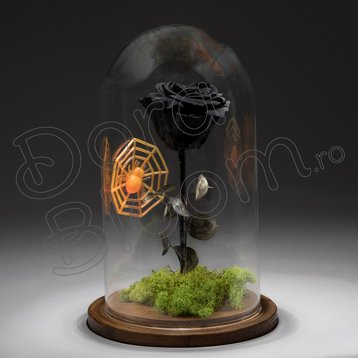 Un aranjament floral cu trandafiri criogenati marca Dora Bloom. Trandafirii prezervati se pastreaza intact in timp multi ani, nu necesita o ingrijire speciala, nici hrana sau apa. La cerere, aranjamentul se poate crea cu trandafiri criogenati si accesorii de alte culori.