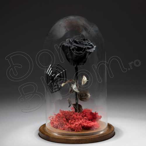 Un aranjament floral tip Beauty and the Beast cu trandafiri criogenati marca Dora Bloom adaptat pentru Halloween. Trandafirii prezervati se pastreaza intact in timp multi ani, nu necesita o ingrijire speciala, nici hrana sau apa. La cerere, aranjamentul se poate crea cu trandafiri criogenati si accesorii de alte culori.