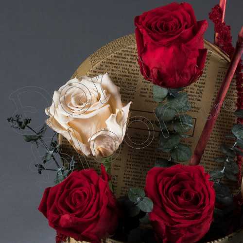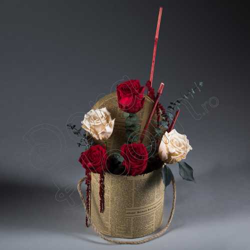 Un aranjament floral cu trandafiri criogenati marca Dora Bloom asezat original intr-o cutie speciala, atent decorata cu alte produse conservate si accesorii asortate. Trandafirii prezervati se pastreaza intact in timp multi ani, nu necesita o ingrijire speciala, nici hrana sau apa. La cerere, aranjamentul se poate crea cu trandafiri criogenati de alte culori.