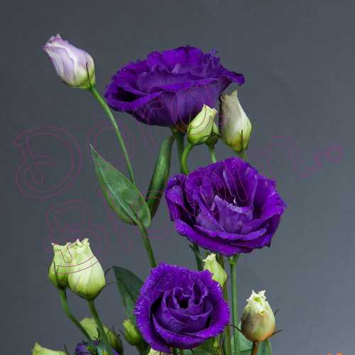 Acest aranjament floral cu eustoma Dark Purple, mini-gerbera Candela, este imbogatit cu frunze proaspate de fatsia si are toate calitatile pentru a fi asezat in centrul atentiei la orice eveniment sau pentru a decora o incapere, fie ca este camera de zi, birou sau receptie.