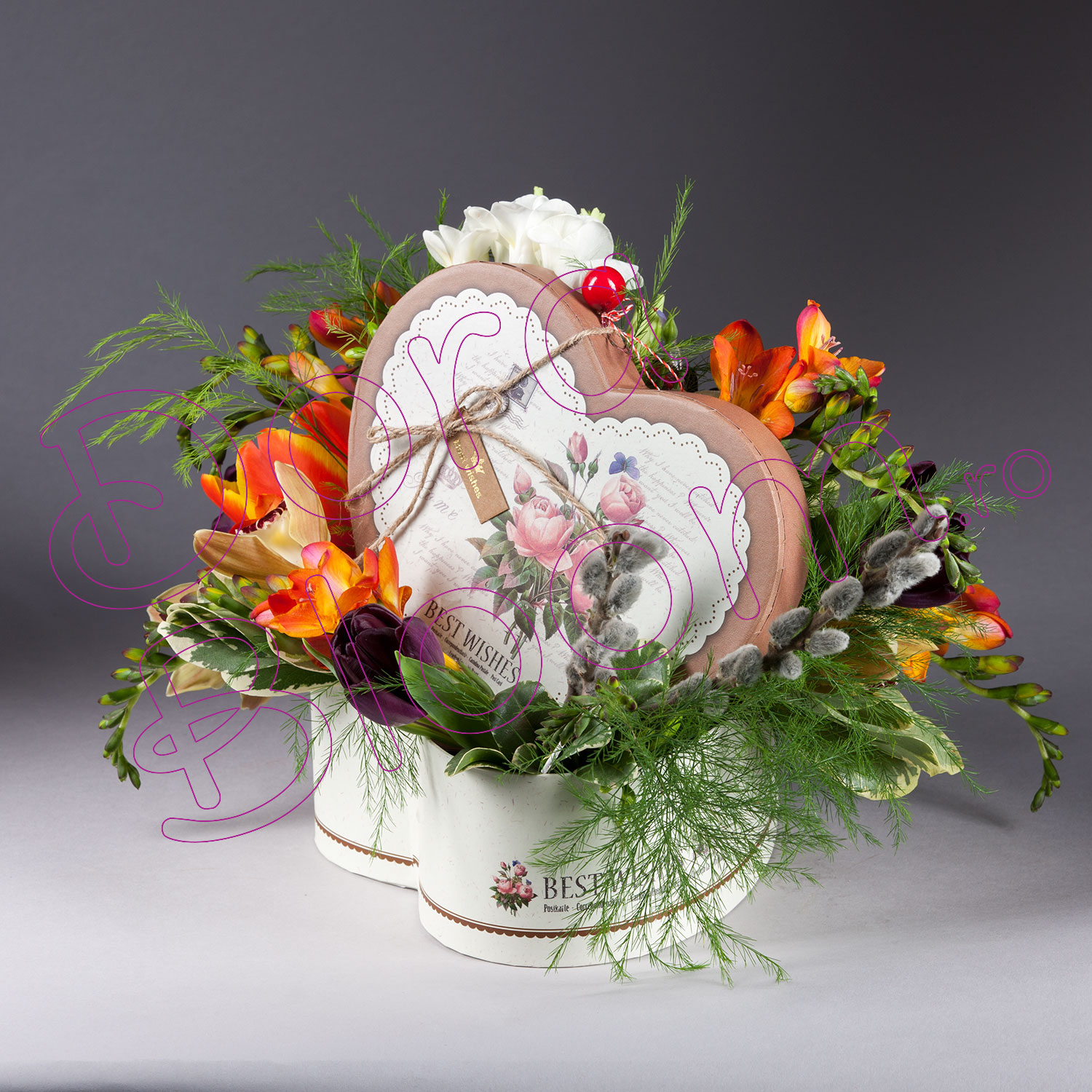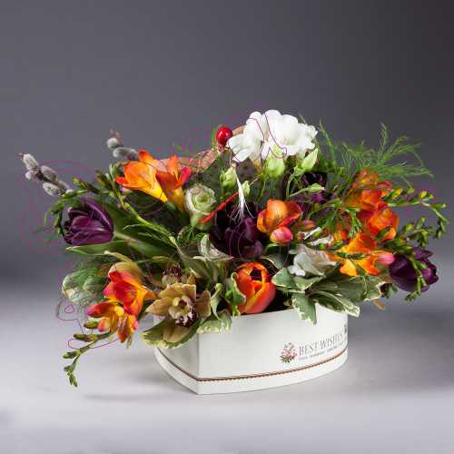Cele mai sincere sentimente, impreuna cu o cutie in forma de inima, in care domnesc flori parfumate, delicat asortate, cu bun-gust asezate.