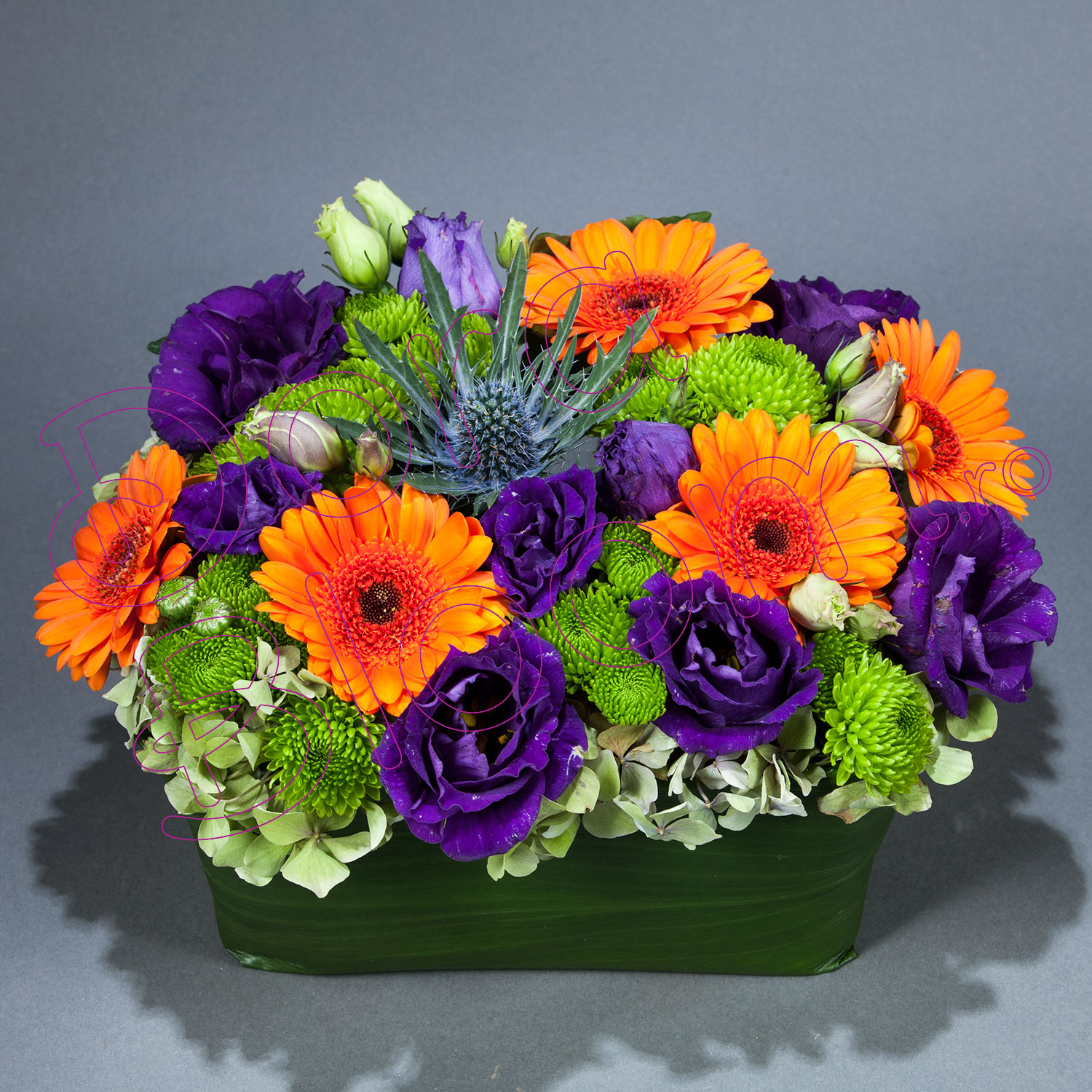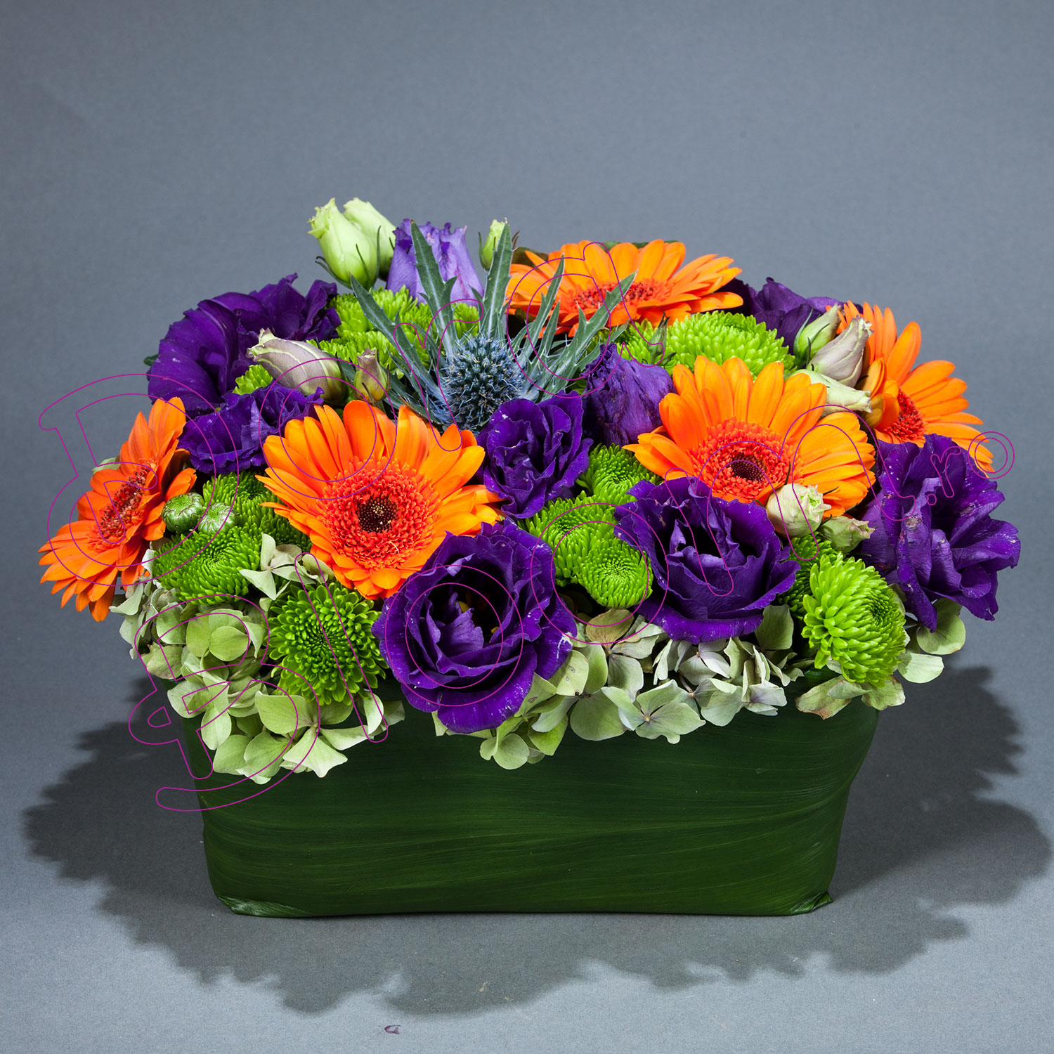 Aranjamentul Bountiful Beautyl este un mod ușor și minunat de a ne inveseli orice zi. Combinatia contrastanta intre eustoma Dark Purple, santini si mini-gerbera Candela este sustinuta de bordura generoasa de hortensie si frunza proaspata de aspidistra.