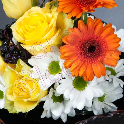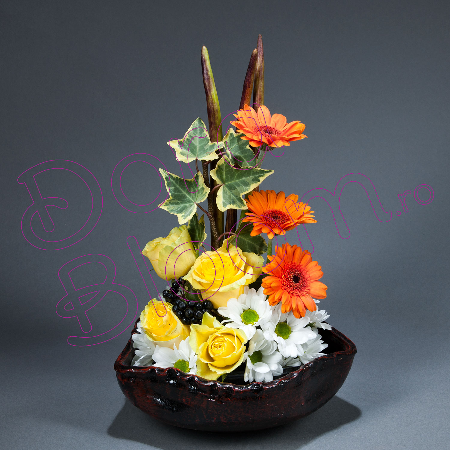 Vibrant, simplu senin este aranjamentul ce se face remarcat prin gerbera proaspata, trandafir delicat si crizantema impletita cu iedera, asezate intr-un vas de ceramica unicat, ales asortat decorului .