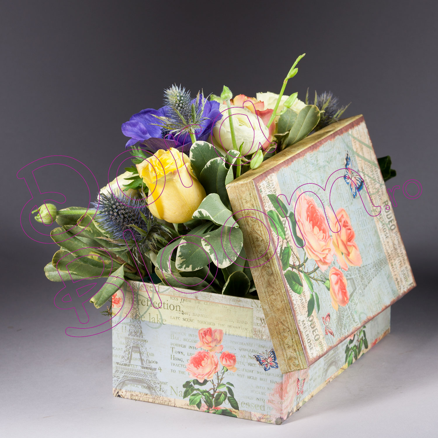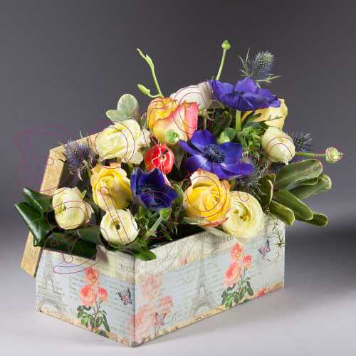 Lumineaza ziua cuiva drag cu aceast aranajment floral in cutie, intr-o cutie plina cu flori vibrante, cu trandafiri, ranunculus, iris si accesorii rafinate, pline de culoare ce fac un cadou perfect pentru orice ocazie. Functie de sezon, pretul creatiei poate varia fata de cel afisat.