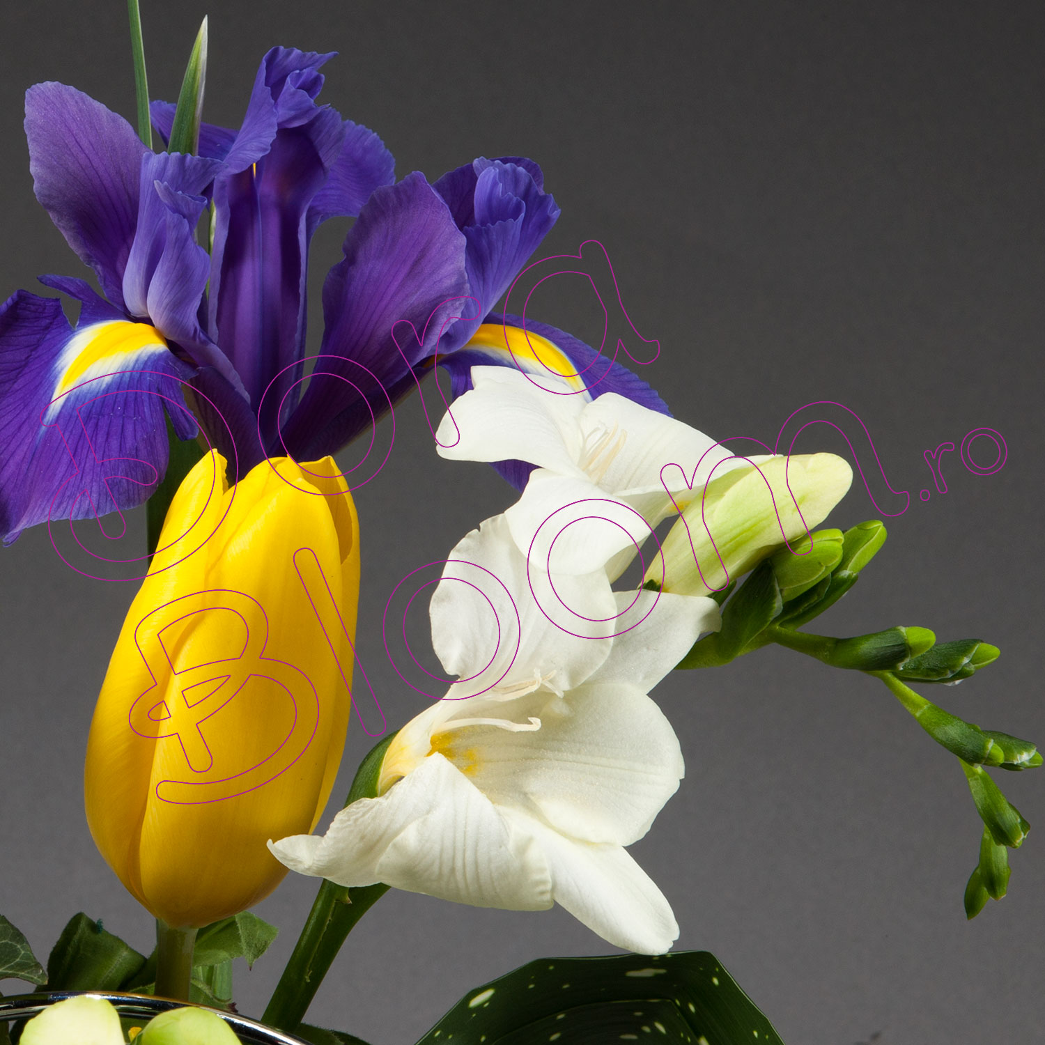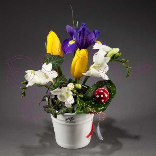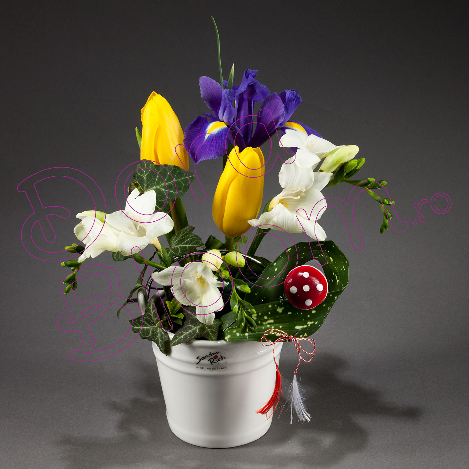 Aranjament floral de primavara, ideal pentru un martisor deosebit, intr-o galetusa din portelan.