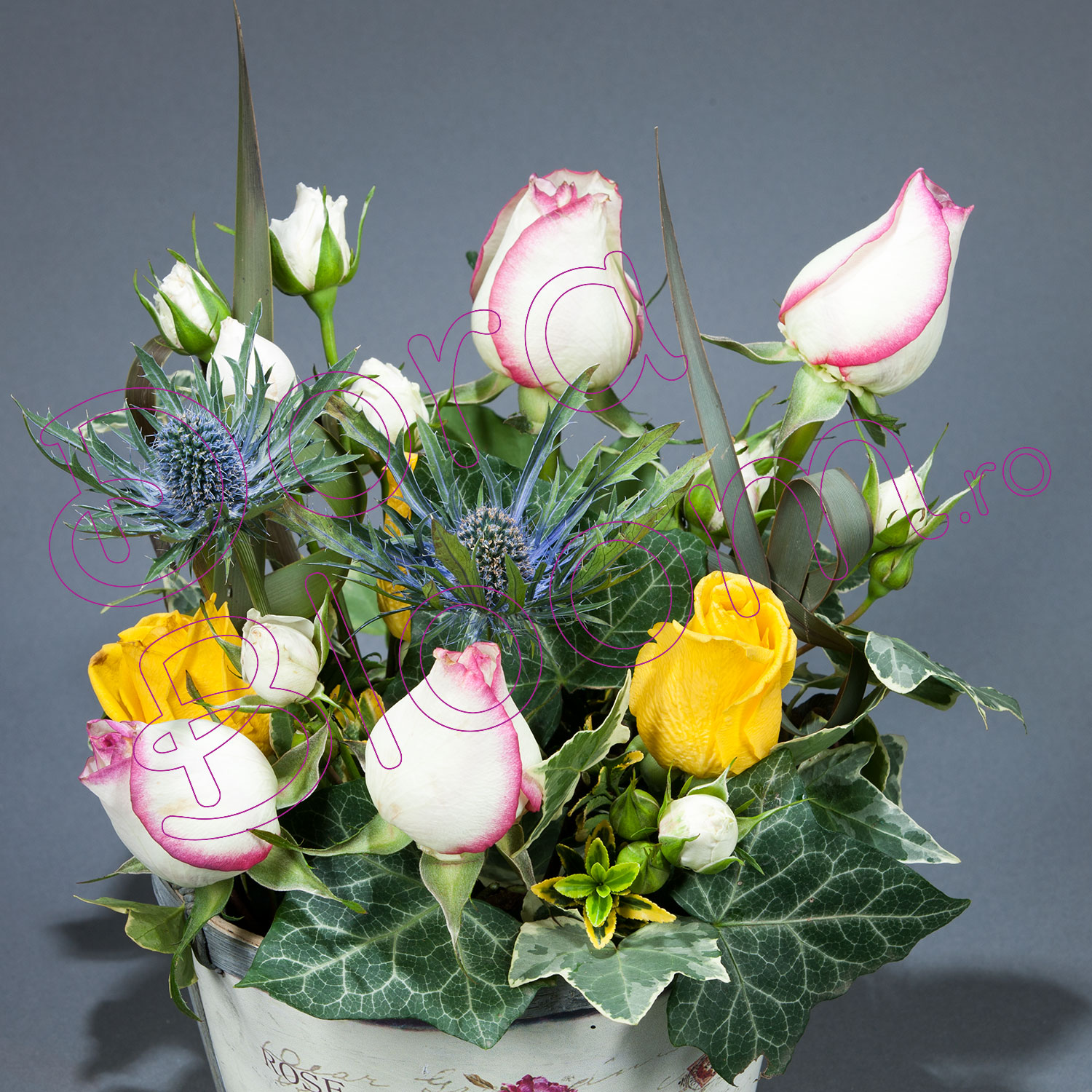 Aranjamentul in vas de lemn cu trandafiri de culori contrastante, cu accentul expresiv al Eryngium-ului este cadoul ideal ce poate fi oferit cu orice ocazie pentru a aduce zambetul pe fata persoanei dragi.