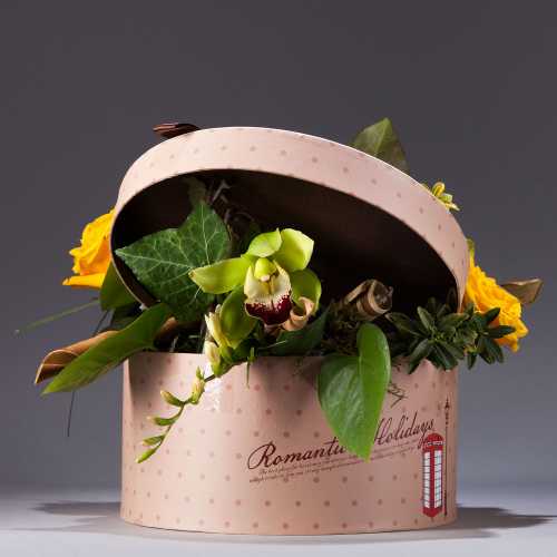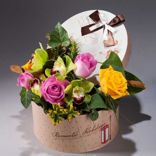 Luminea ziua cuiva drag cu aceast aranjament floral in cutie! Ticsita cu flori proaspete de trandafir, cymbidium si multe accesorii rafinate, aceasta cutie plina de culoare este cadoul perfect pentru orice ocazie! La cerere, aranjamentul floral se poate executa cu alte flori. Cutia este unicat (diametrul 18 cm)