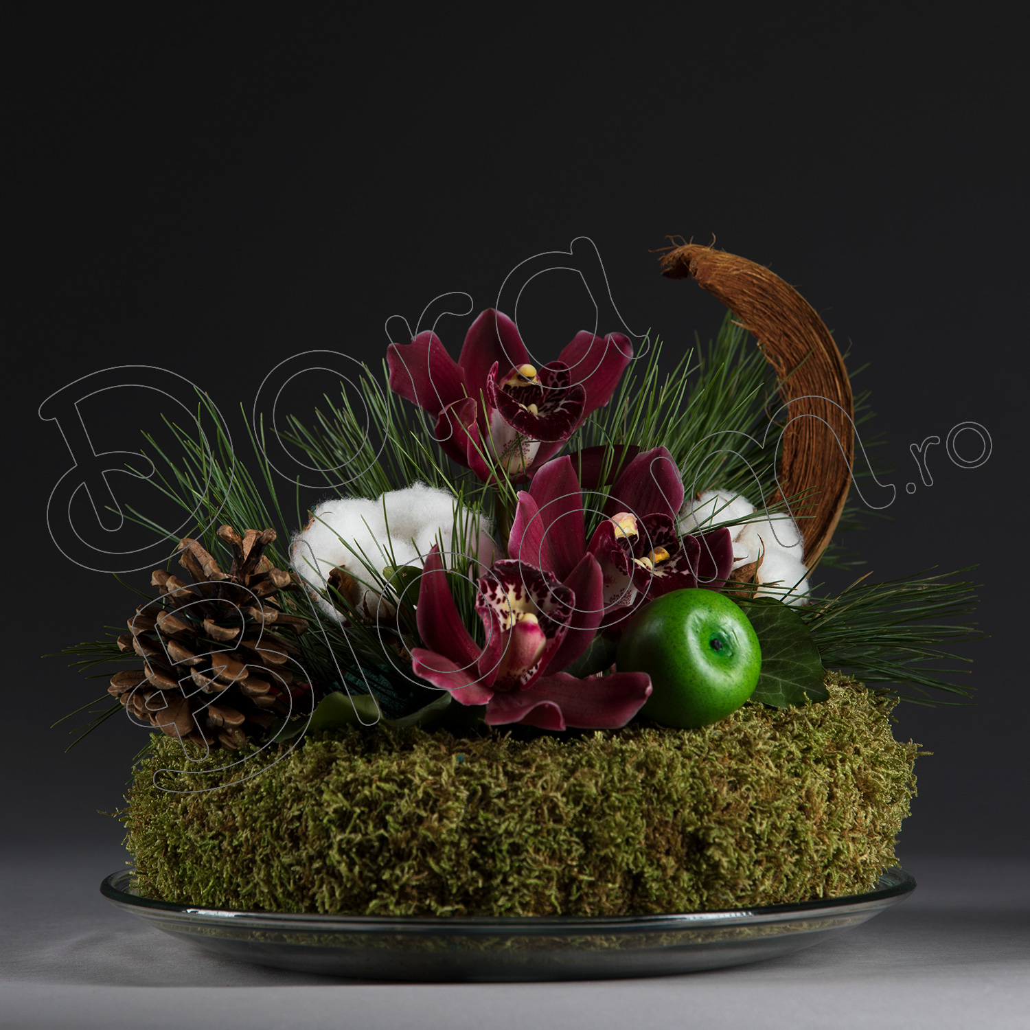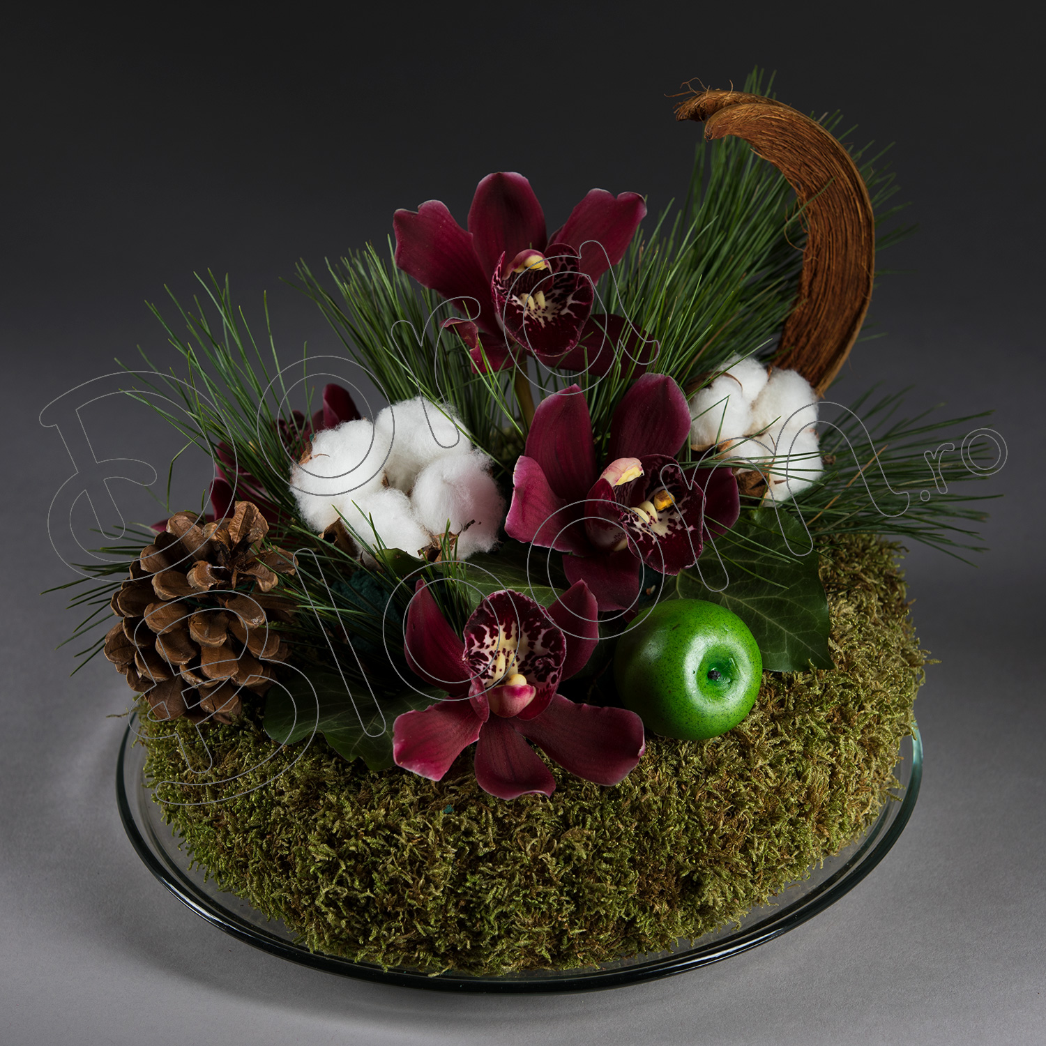 Un aranjament floral decorat cu accesorii specifice de Sarbatori.