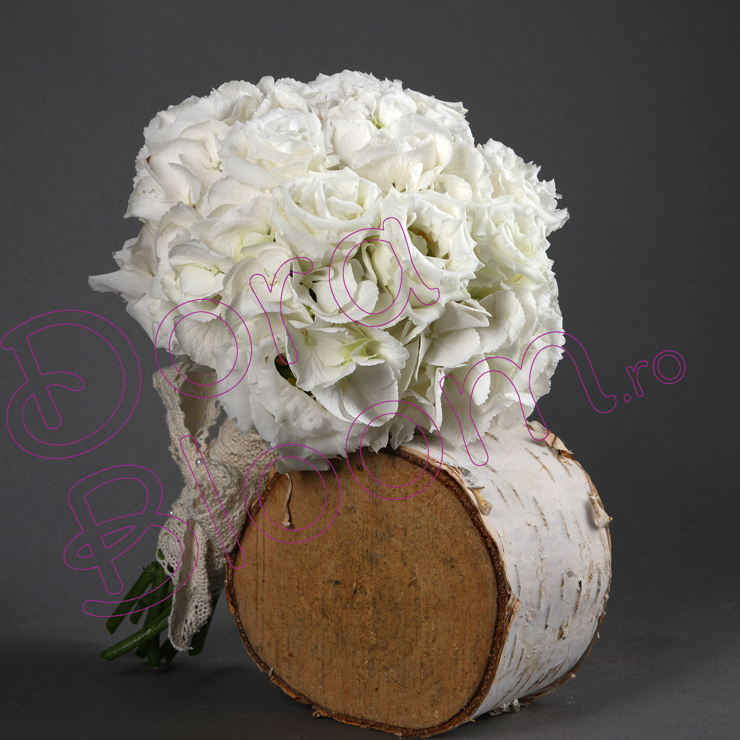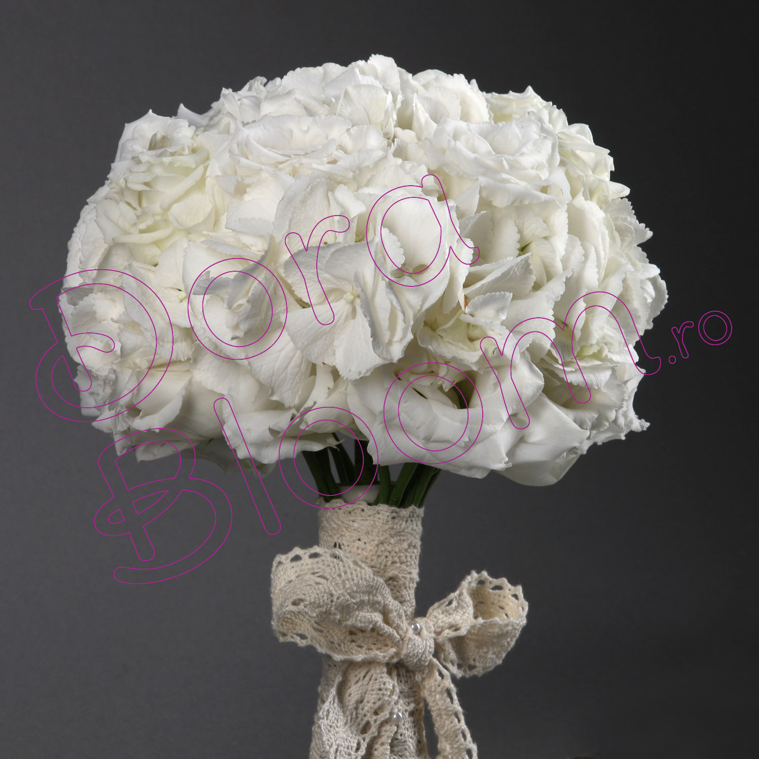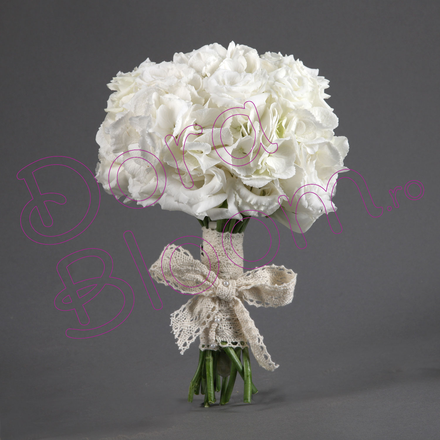 Un buchet de mireasa impecabil, seducator si elegant, realizat cu hortensie si lisianthus.