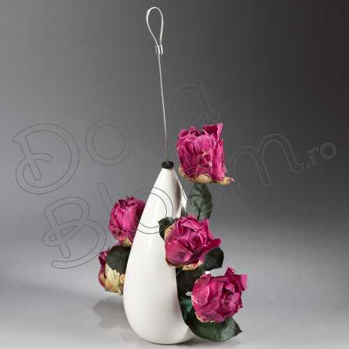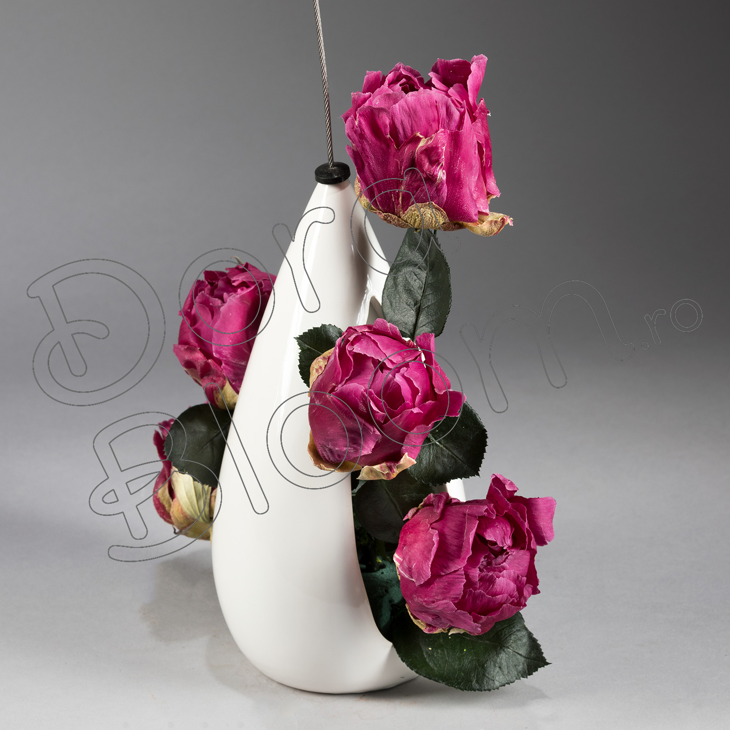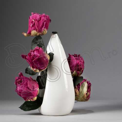 Un aranjament floral cu bujori criogenati marca Dora Bloom asezat intr-un vas elegant de portelan. Este un cadou original, este o surpriza inedita, este un "Bine ati venit!" asezat intr-o receptie. Se pastreaza intact in timp multi ani, nu necesita o ingrijire speciala, nici hrana sau apa. La cerere, aranjamentul se poate crea si cu trandafiri criogenati (diferite culori).