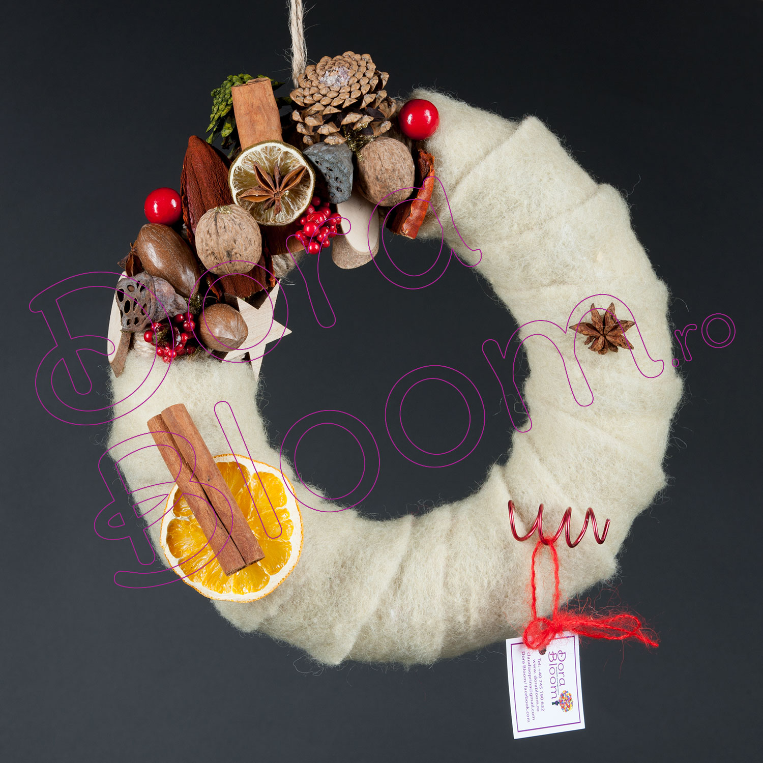 Decor coronita pentru Sarbatorile de Iarna, realizat cu lana si accesorii de Craciun.