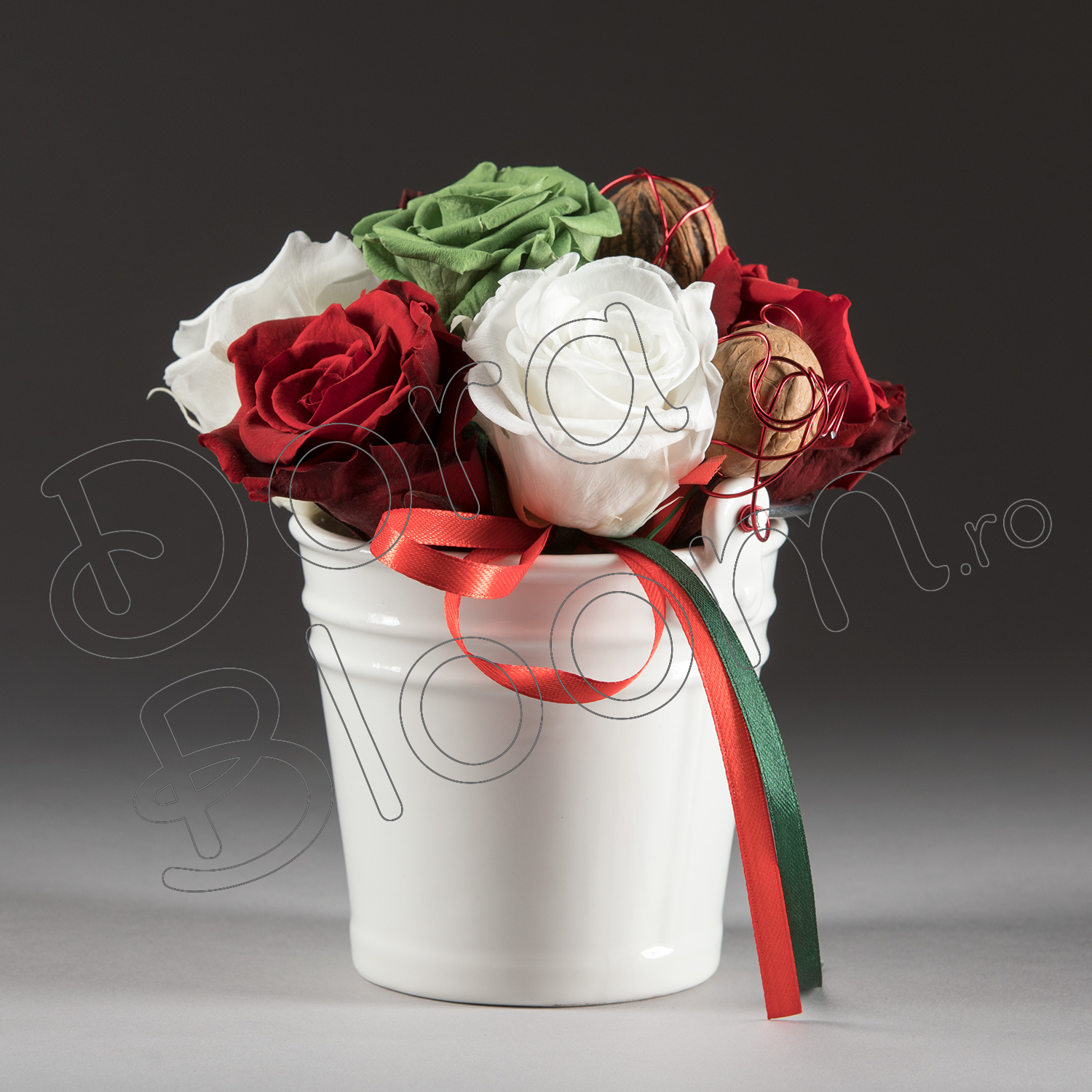 Un aranjament floral cu trandafiri criogenati marca Dora Bloom asezat intr-un vas elegant de portelan, decorat cu bumbac si accesorii asortate. Este un cadou original, este o surpriza inedita, este un "Bine ati venit!" asezat intr-o receptie. Se pastreaza intact in timp multi ani, nu necesita o ingrijire speciala, nici hrana sau apa. La cerere, aranjamentul se poate crea si cu trandafiri criogenati (diferite culori).