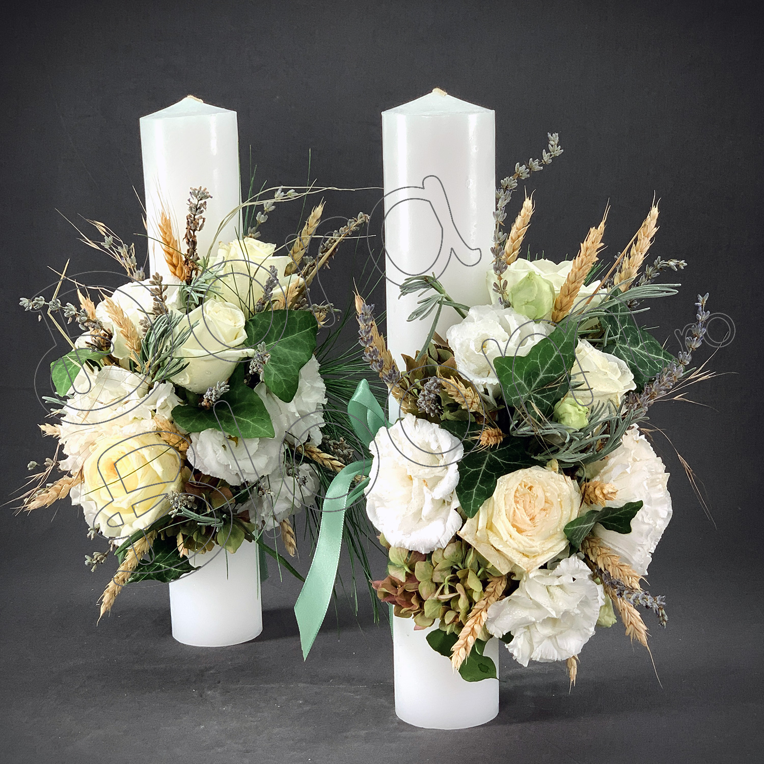 Lumanari pentru cununie decorate cu Grau traditional, lavanda parfumata si trandafir alb elegant
