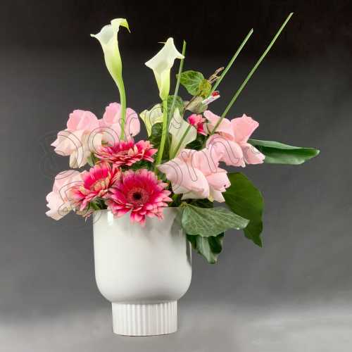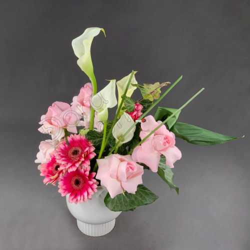 Aranjament floral asezat in vas elegant de portelan, un cadou corporate vesel, de primavara creat cu trandafiri flexati, cale si gerbera. La cerere, creatia florala se poate modifica in combinatia cromatica si compozitionala preferata.