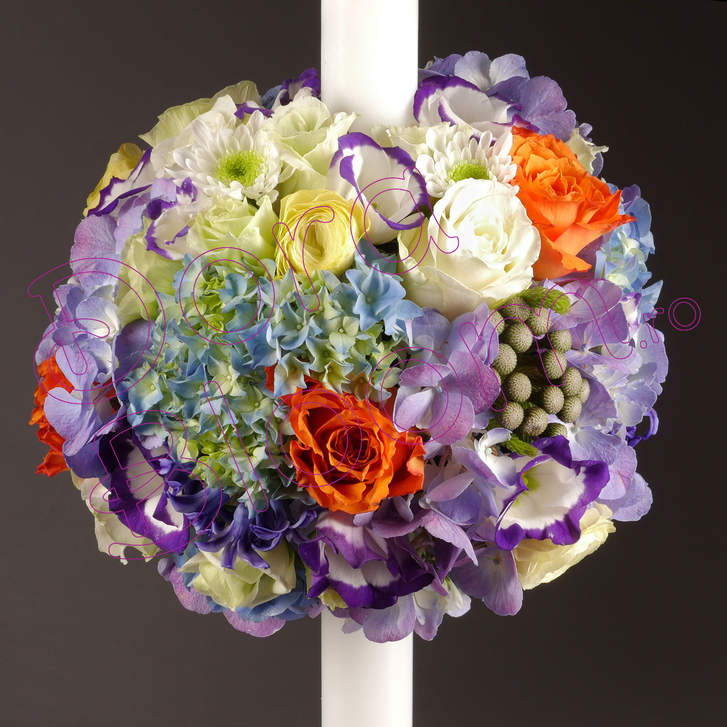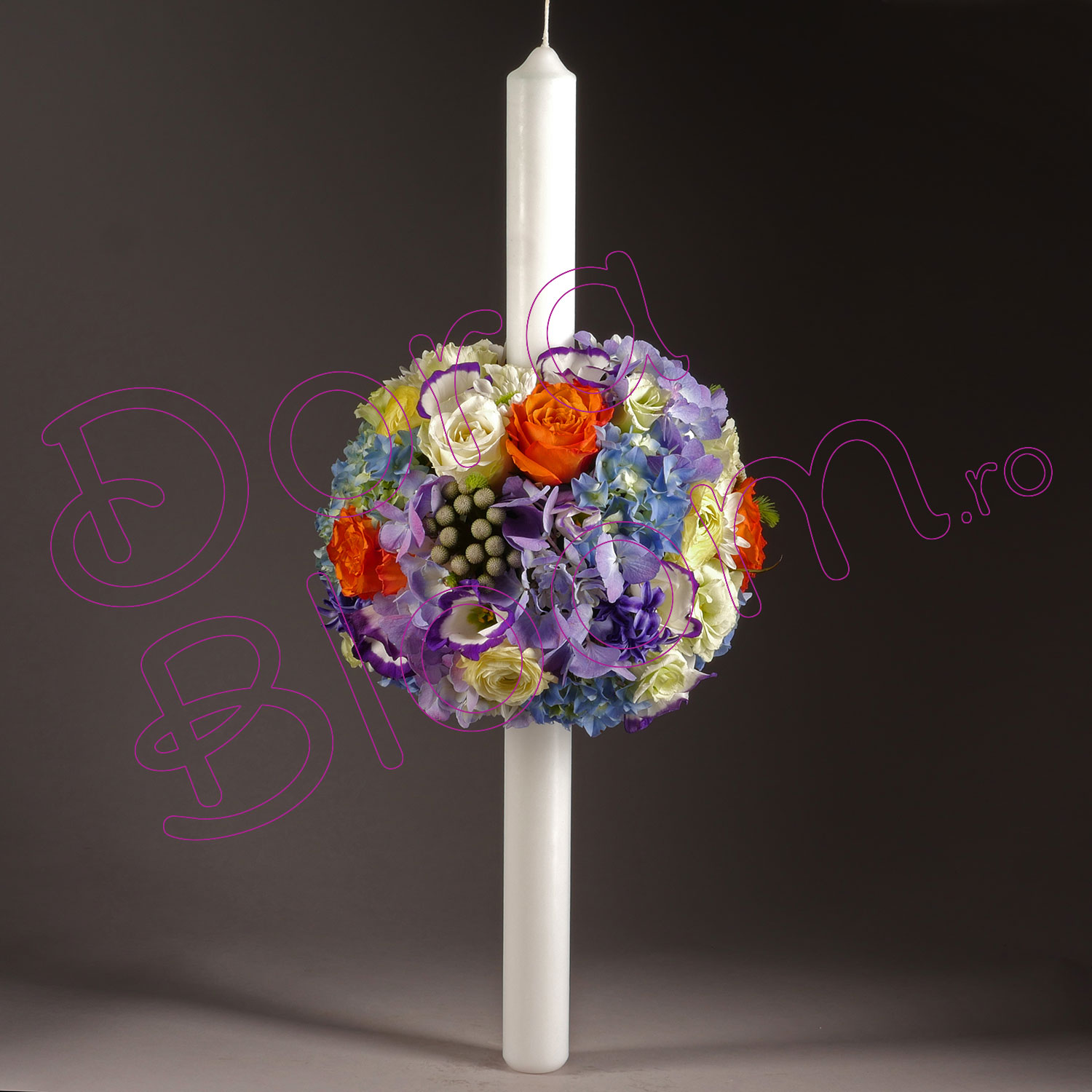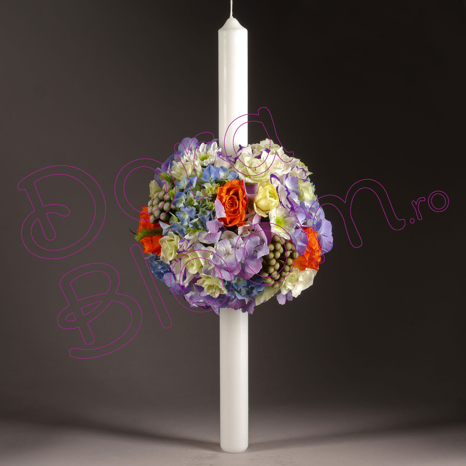 Lumanare decorata cu un aranjament rafinat, care se remarca prin florile colorate, asezate cu bun gust, imbinate armonios si echilibrat.