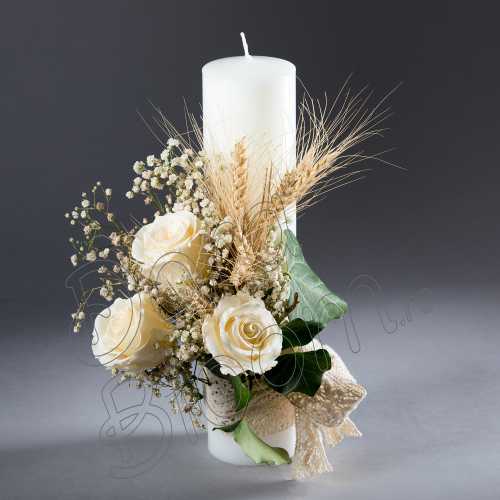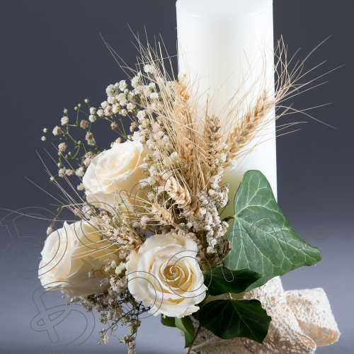 Eleganta si rafinament pentru un bun inceput de drum. Lumanarea decorata cu un buchet din 3 tranadafiri criogenati, decorat cu spice de grau. Trandafirii criogenati vor fi pastrati multi ani, si, o data cu ei si emotia din timpul slujbei de botez. In functie de preferinte, se poate alege culoarea trandafirilor.