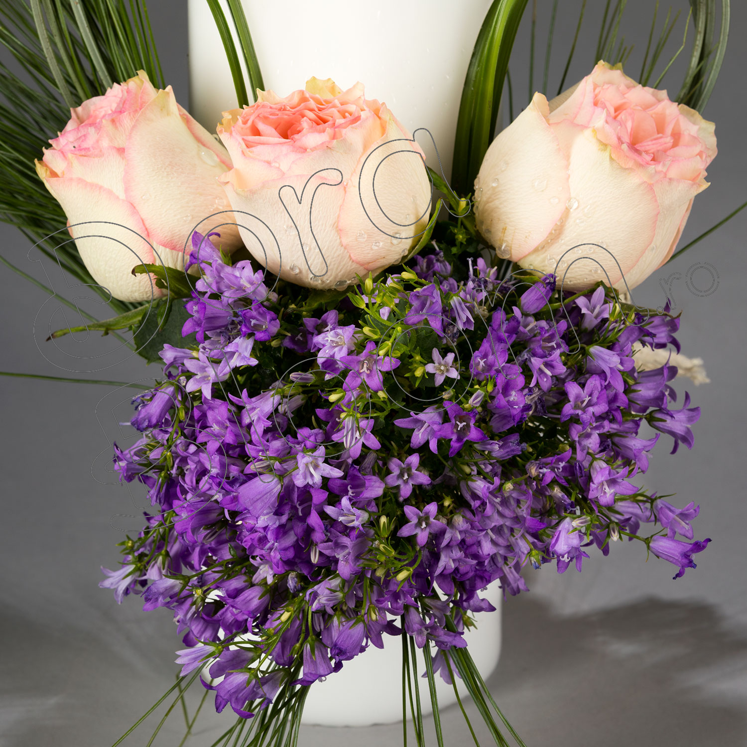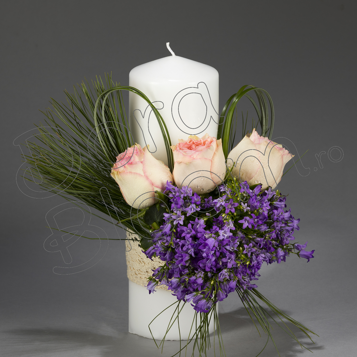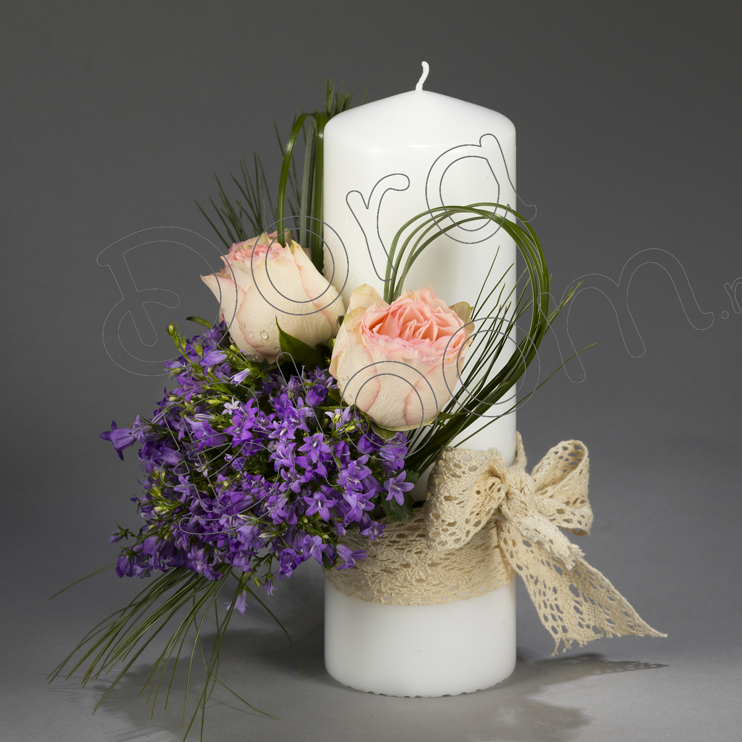 Lumanare decorata cu un aranjament vesel, din hortensie si trandafiri.