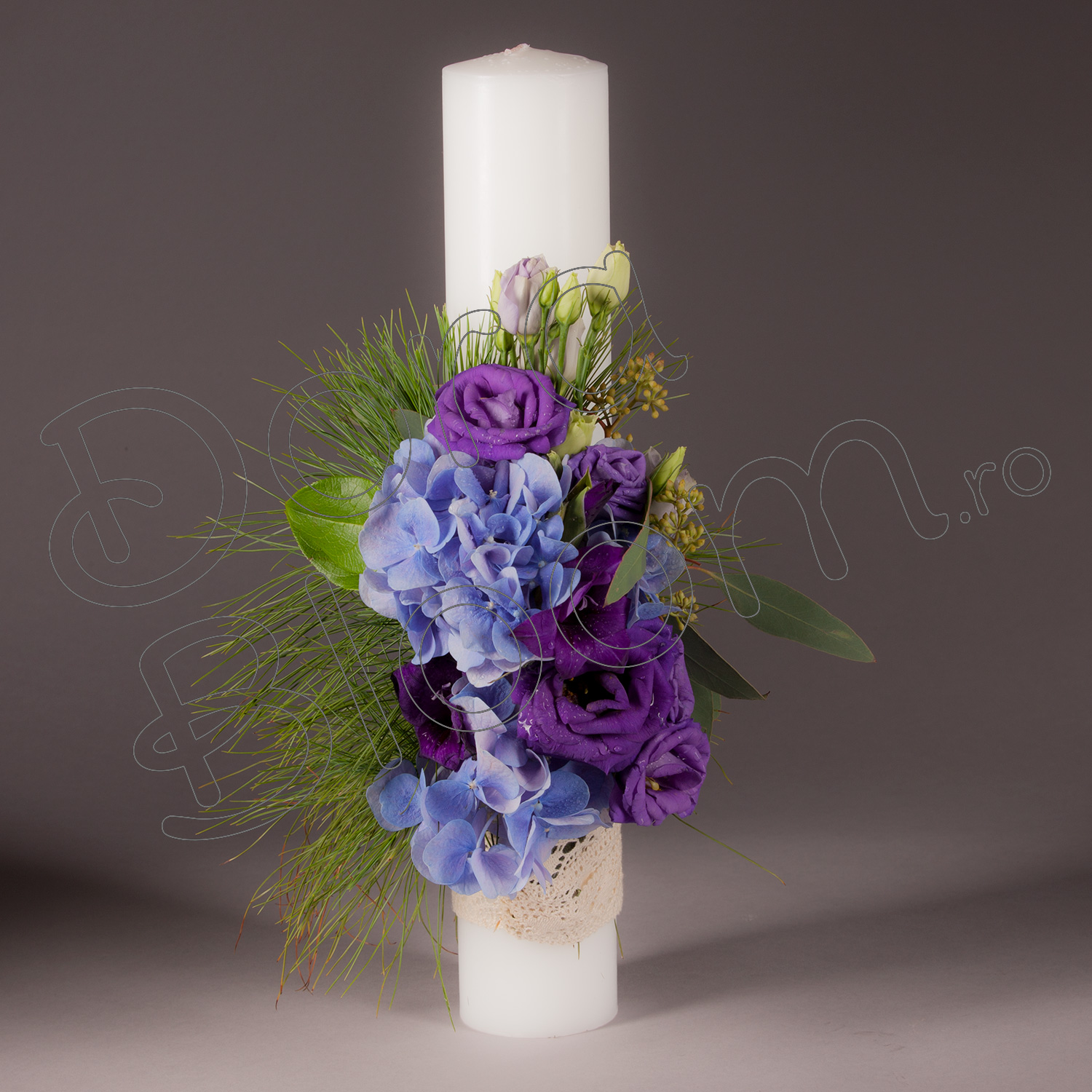 Lumanare pentru botez decorata cu un aranjament vesel, din lisianthus si hortensie.