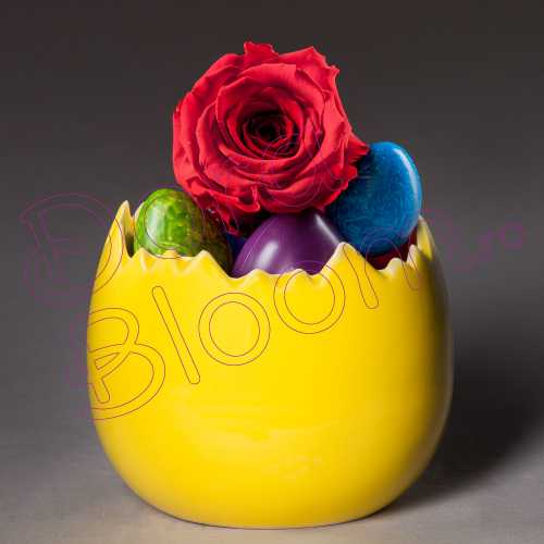 Pentru o astfel de sarbatoare, un design deosebit cu trandafir criogenat, marca Dora Bloom. Comanda acest aranjament rafinat pentru a decora orice incapere sau surprinde-ti partenerii de afacere cu un cadou inedit. La cerere, aranjamentul se poate crea cu mai multi trandafiri, in mai multe culori si alte tipuri de vase.