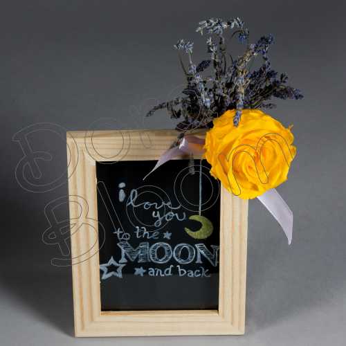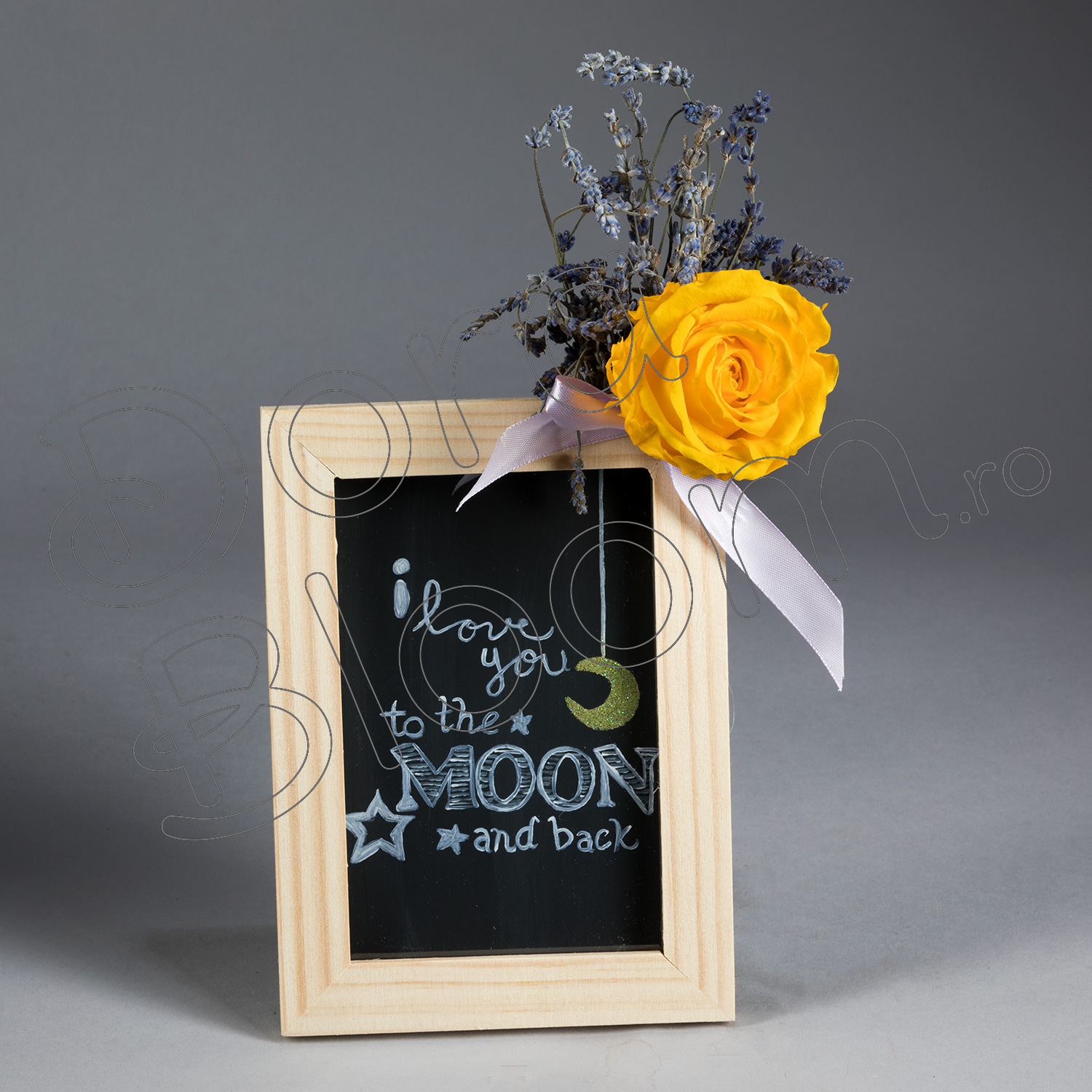 Un aranjament floral cu trandafiri criogenati marca Dora Bloom asezat original pe o rama foto, pe care pictam mesajul tau motivational, ideile tale frumoase sau cuvintele sincere pentru cei dragi. Se pastreaza intact in timp multi ani, nu necesita o ingrijire speciala, nici hrana sau apa. La cerere, aranjamentul se poate crea cu bujori conservati sau cu trandafiri criogenati de alte culori.