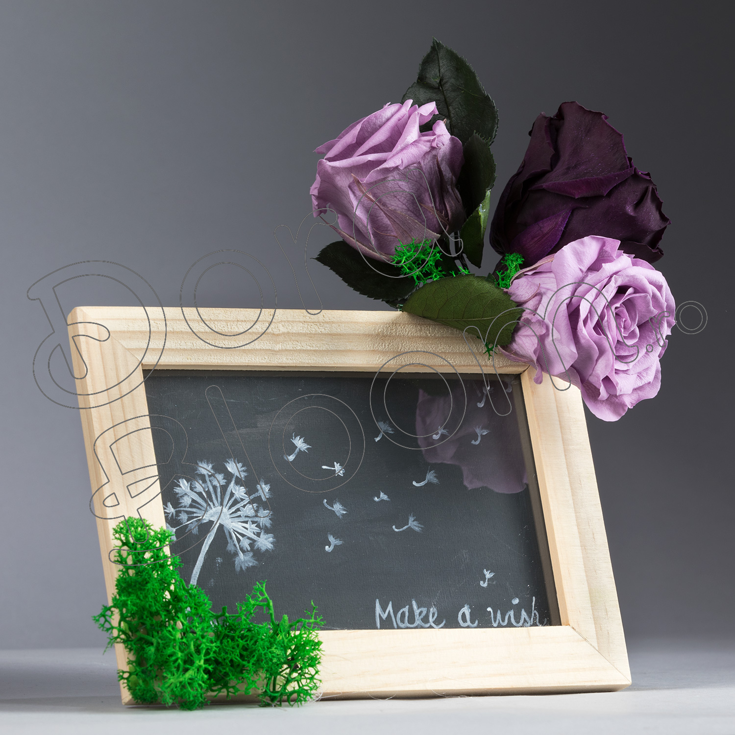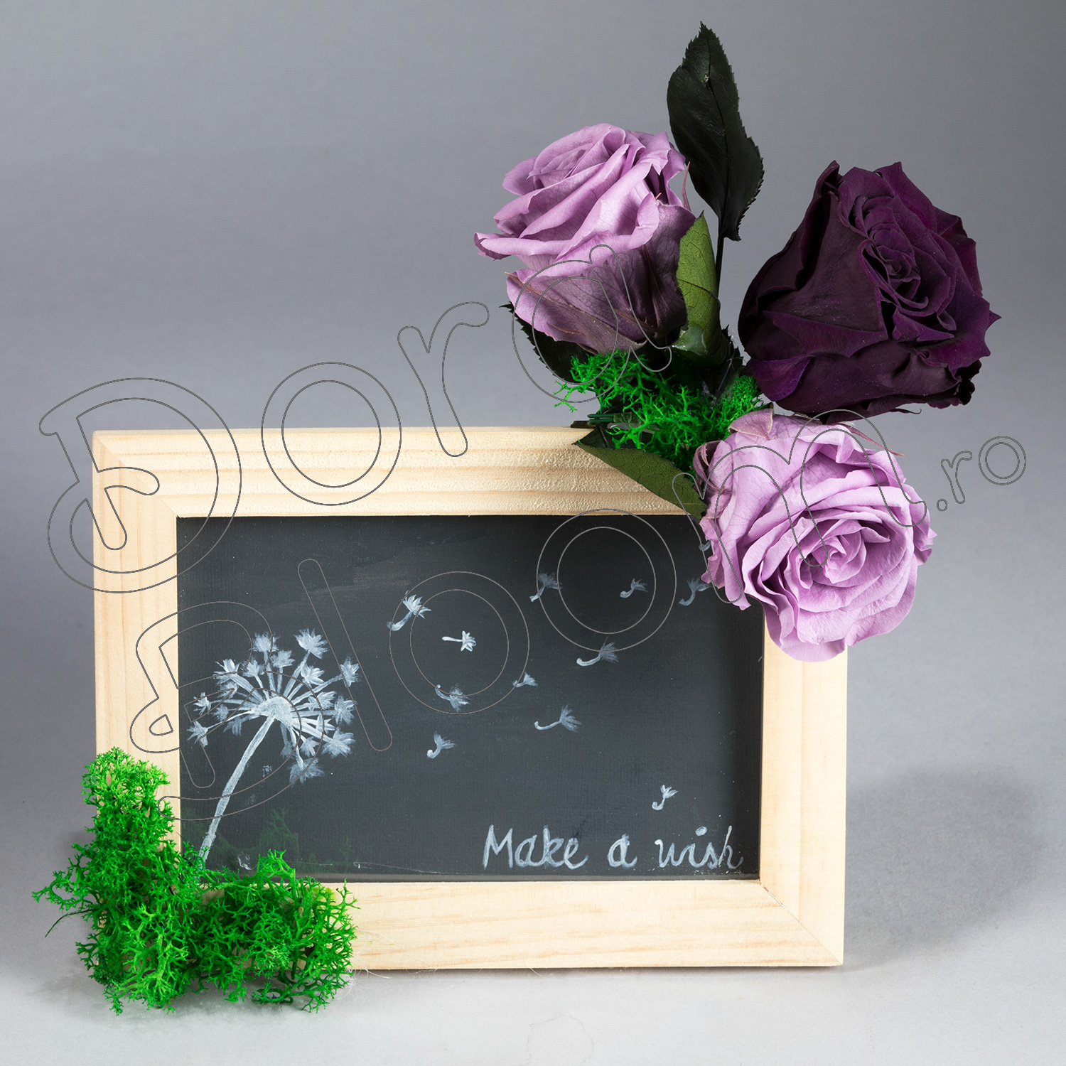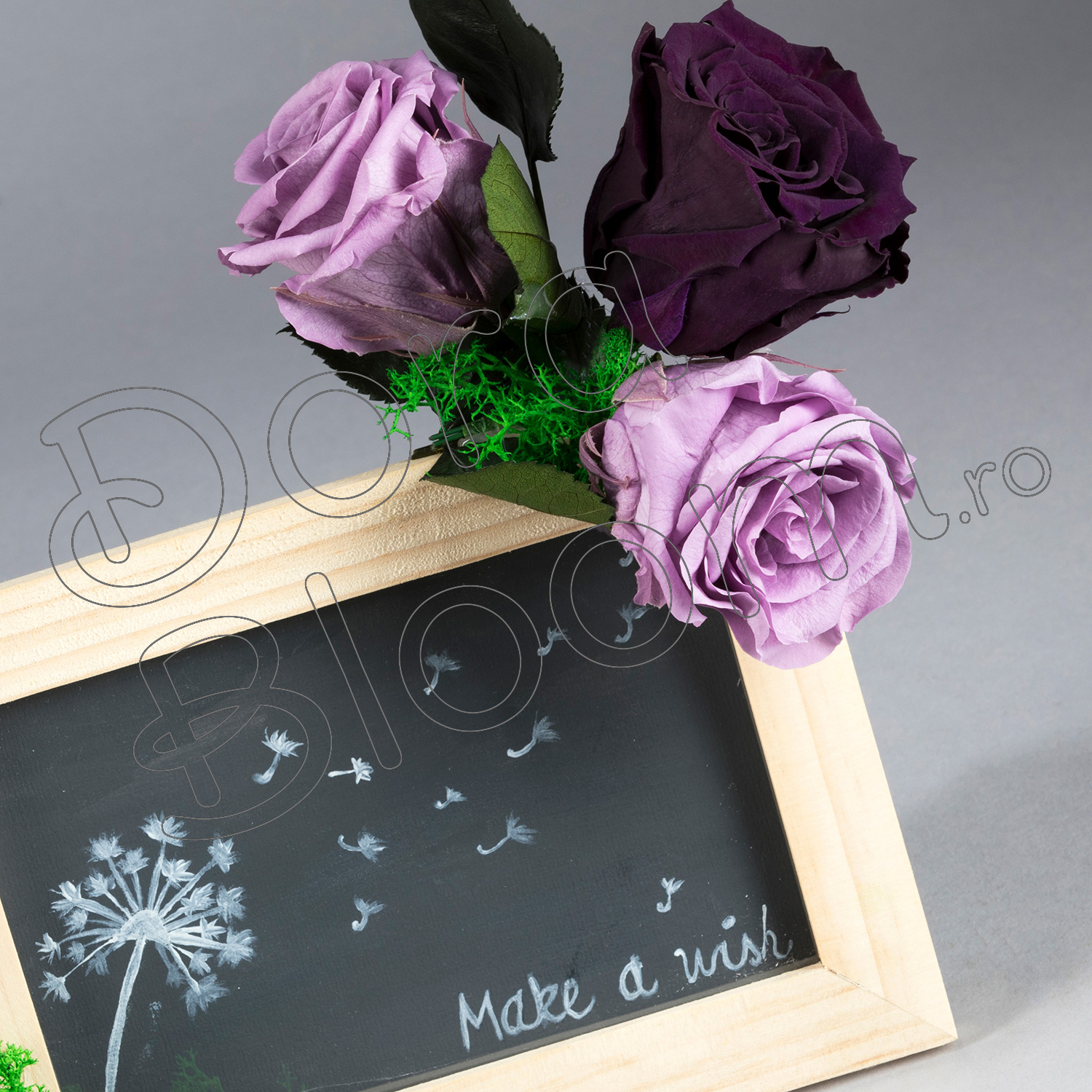 Un aranjament floral cu trandafiri criogenati marca Dora Bloom asezat original pe o rama foto, pe care pictam mesajul tau motivational, ideile tale frumoase sau cuvintele sincere pentru cei dragi. Este un dar lesne de oferit, este un cadou corporate deosebit, este o surpriza inedita, este un "Bine ati venit!" asezat intr-o receptie. Se pastreaza intact in timp multi ani, nu necesita o ingrijire speciala, nici hrana sau apa. La cerere, aranjamentul se poate crea cu bujori conservati sau cu trandafiri criogenati de alte culori.